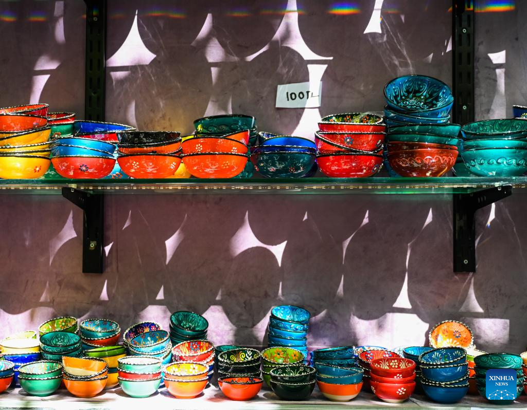 This photo taken on July 15, 2024 shows porcelains at the Grand Bazaar of Istanbul, Türkiye. The time-honored Grand Bazaar, which boasts a history of more than 500 years, is one of the oldest and largest bazaars in the world. (Xinhua/Liu Lei)