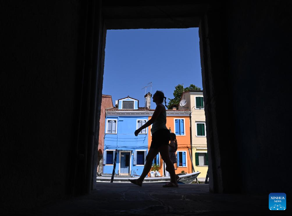Tourists visit the colorful houses in Burano island, Venice, Italy, July 18, 2024. (Photo by Alberto Lingria/Xinhua)