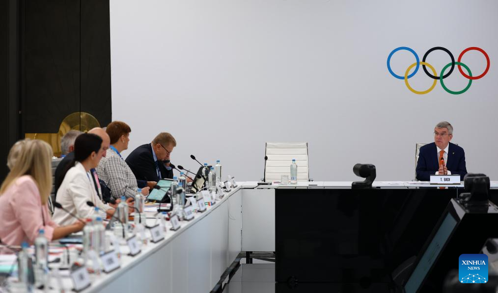 International Olympic Committee (IOC) President Thomas Bach (R) delivers a speech during the IOC Executive Board meeting in Paris, July 20, 2024. (Kai Pfaffenbach/Reuters/Pool via Xinhua)