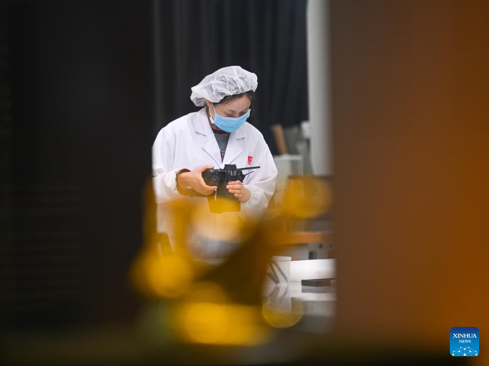A staff member takes photos of cultural relics at the Sanxingdui Museum in Guanghan City, southwest China's Sichuan Province, July 23, 2024. (Xinhua/Wang Xi)