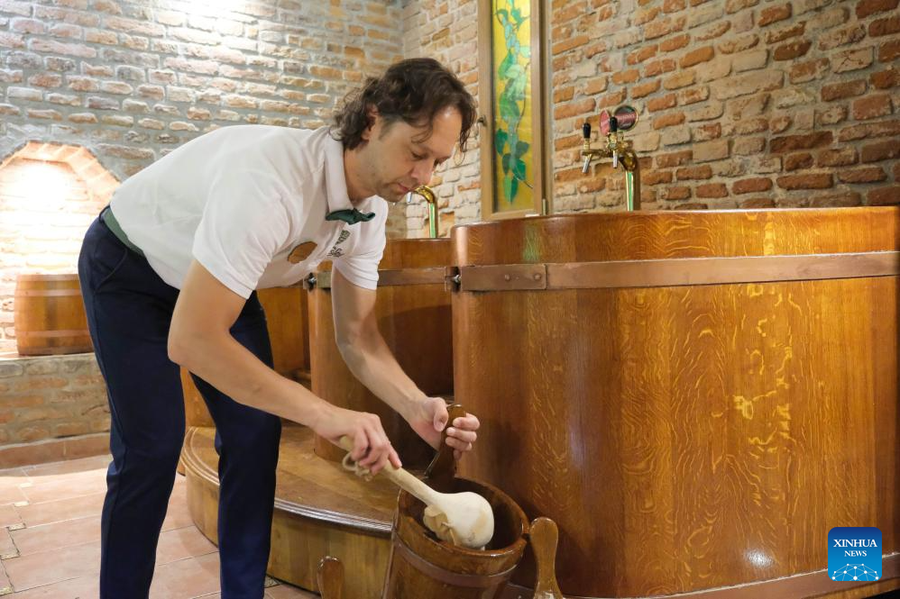 Jaromir Pazout prepares a beer bath at the Original Beer Spa in Prague, the Czech Republic, on Aug. 1, 2024. Jaromir Pazout, who founded the Original Beer Spa in 2013, noted that his franchise business has expanded to three locations in the Czech capital and estimated that there are around 40 to 50 beer spas in the whole country, with up to 20 in Prague alone. (Xinhua/Deng Yaomin)