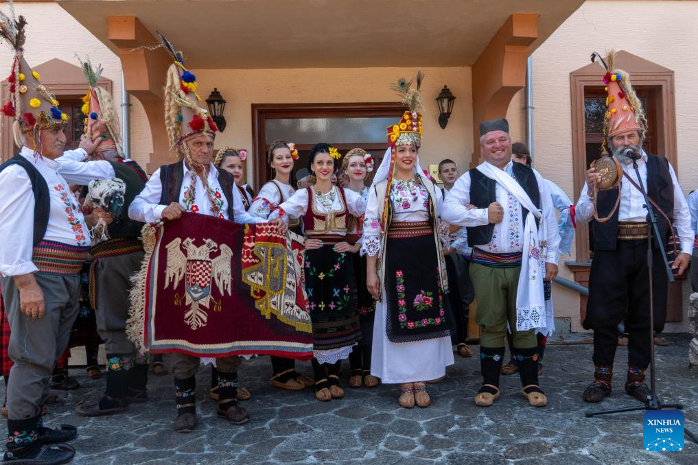 A traditional Serbian wedding ceremony is held during the 63rd Guca Trumpet Festival in the village of Guca, Serbia on Aug. 4, 2024. (Photo by Nemanja Cabric/Xinhua)