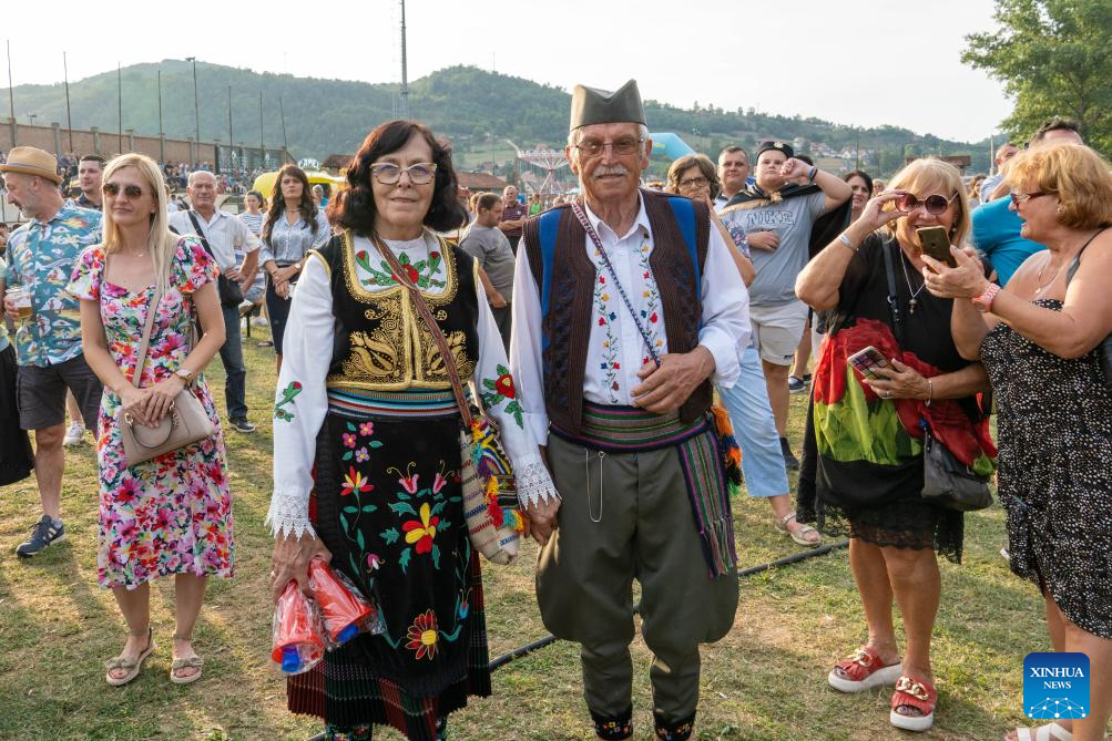 A couple in Serbian traditional folk costumes are pictured at the venue of a brass orchestra competition during the 63rd Guca Trumpet Festival in the village of Guca, Serbia on Aug. 4, 2024. (Photo by Nemanja Cabric/Xinhua)