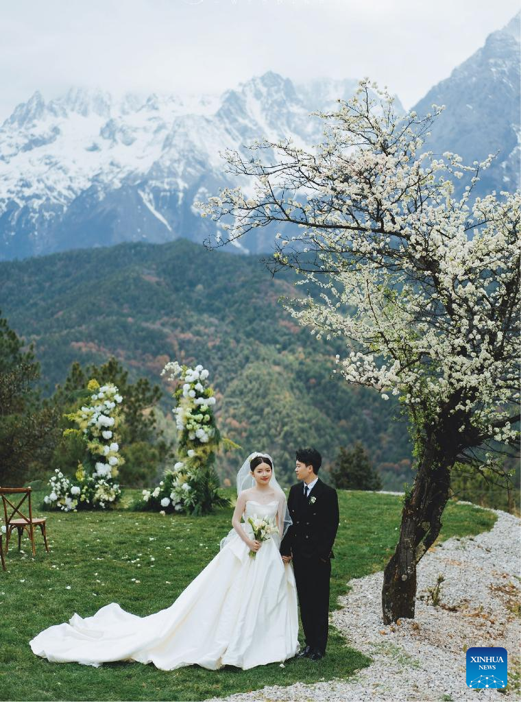 A couple poses for a photo with the snow-capped mountains in the background during the destination wedding in Lijiang, southwest China's Yunnan Province, April 7, 2024. (Xinhua)