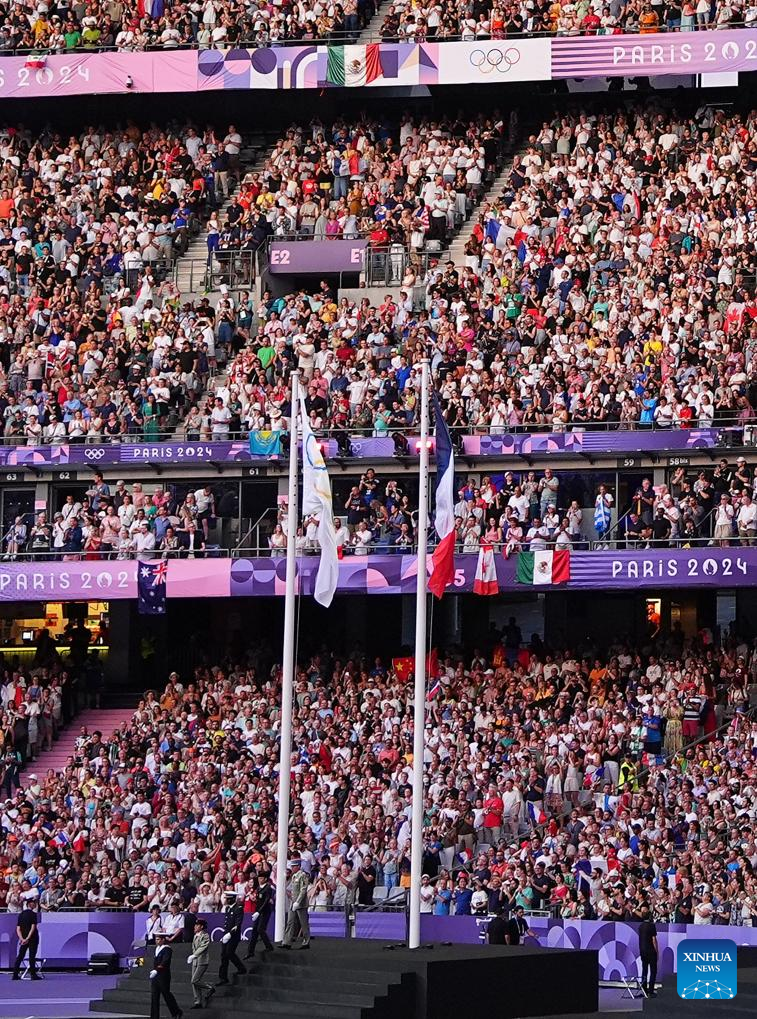 A flag-raising ceremony is held during the closing ceremony of the Paris 2024 Olympic Games at the Stade de France in Paris, France, Aug. 11, 2024. (Xinhua/Xu Chang)