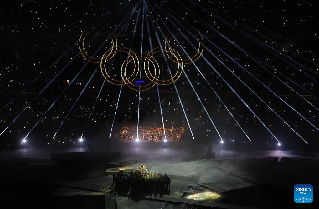 Actors perform as the Olympic rings are raised during the closing ceremony of the Paris 2024 Olympic Games at the Stade de France in Paris, France, Aug. 11, 2024. (Xinhua/Jin Haoyuan)