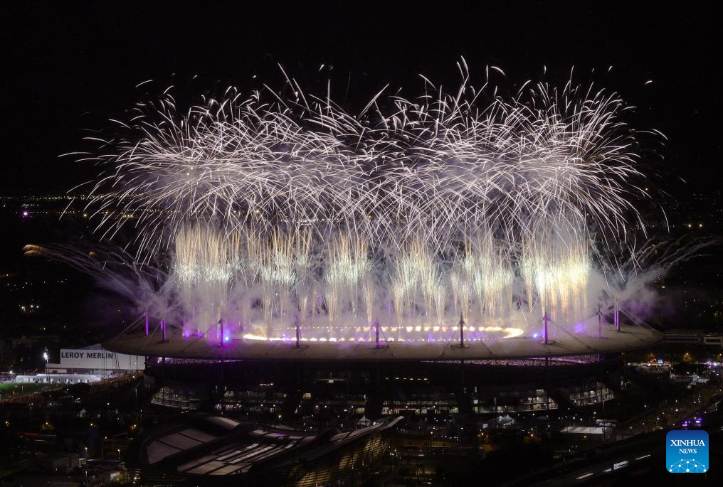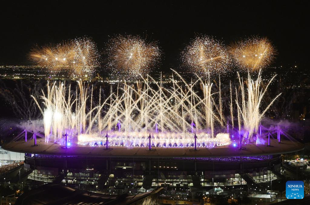 Fireworks explode during the closing ceremony of the Paris 2024 Olympic Games at the Stade de France in Paris, France, Aug. 11, 2024. (Xinhua/Lui Siu Wai)