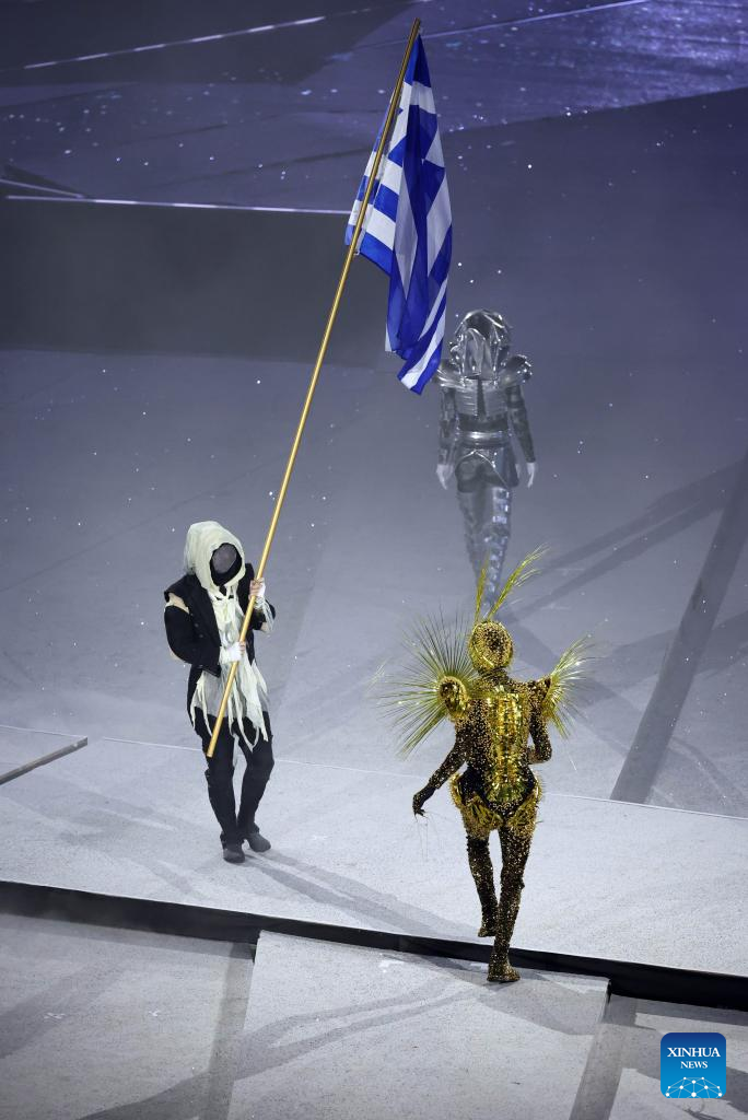 The Golden Voyager carries the national flag of Greece during the closing ceremony of the Paris 2024 Olympic Games at the Stade de France in Paris, France, Aug. 11, 2024. (Xinhua/Xu Chang)
