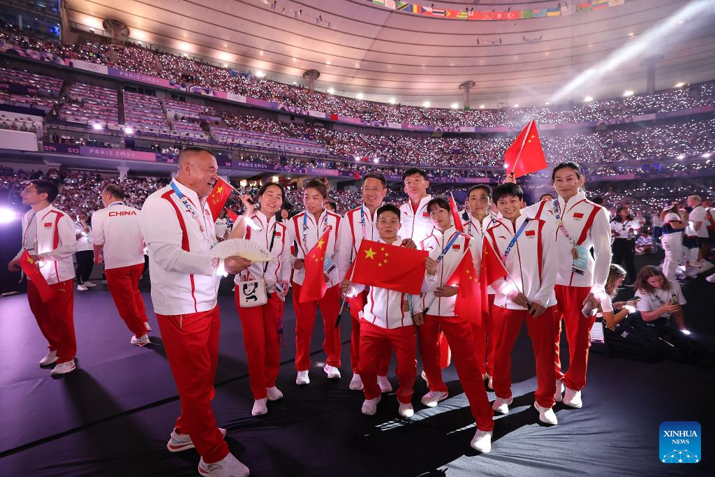 Members of the Chinese delegation attend the closing ceremony of the Paris 2024 Olympic Games in Paris, France, Aug. 11, 2024. (Xinhua/Li Ming)