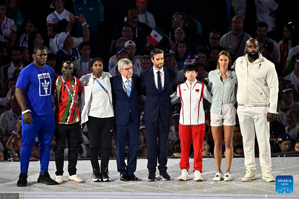 (L to R)Mijain Lopez Nunez of Cuba, Eliud Kipchoge of Kenya, Djankeu Ngamba of Refugee Olympic Team, International Olympic Committee (IOC) President Thomas Bach, Paris 2024 President Tony Estanguet, Sun Yingsha of China, Emma McKeon of Australia and Teddy Riner of France pose for a group photo during the closing ceremony of the Paris 2024 Olympic Games at the Stade de France in Paris, France, Aug. 11, 2024. (Xinhua/Wang Peng)
