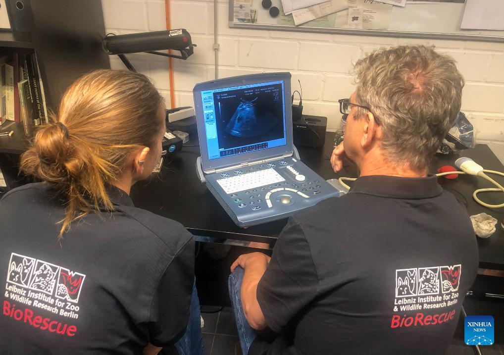 Staff members check an image from an ultrasound scan of giant panda Meng Meng in Berlin, Germany, Aug. 11, 2024. (Berlin Zoo/Handout via Xinhua)