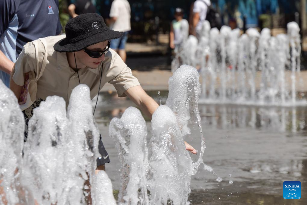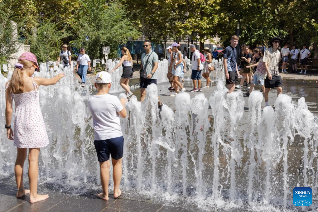 People enjoy cool water at a fountain in downtown Budapest, Hungary on Aug. 16, 2024. (Photo by Attila Volgyi/Xinhua)