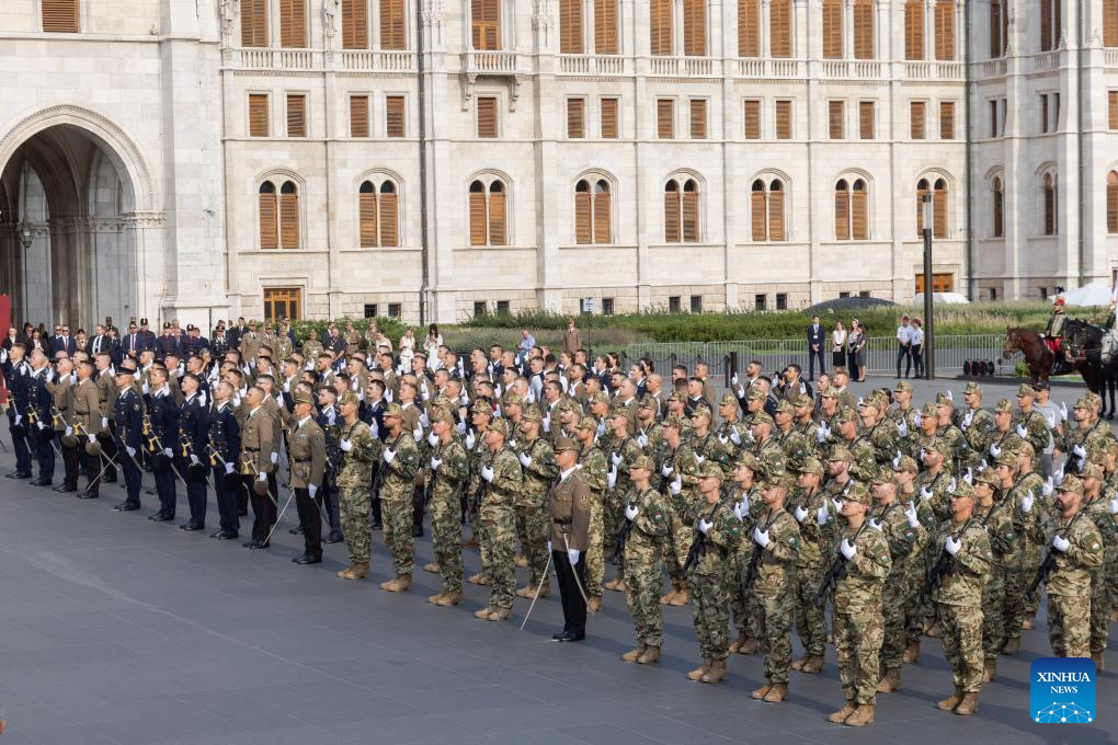 Newly graduated military officer candidates take their oath during a ceremony to celebrate Hungarian national holiday at Kossuth Square in front of the parliament building in Budapest, Hungary on Aug. 20, 2024. Hungary marked its national holiday and commemorated Saint Stephen (969-1038), the founding king of Hungary, on Tuesday. (Photo by Attila Volgyi/Xinhua)