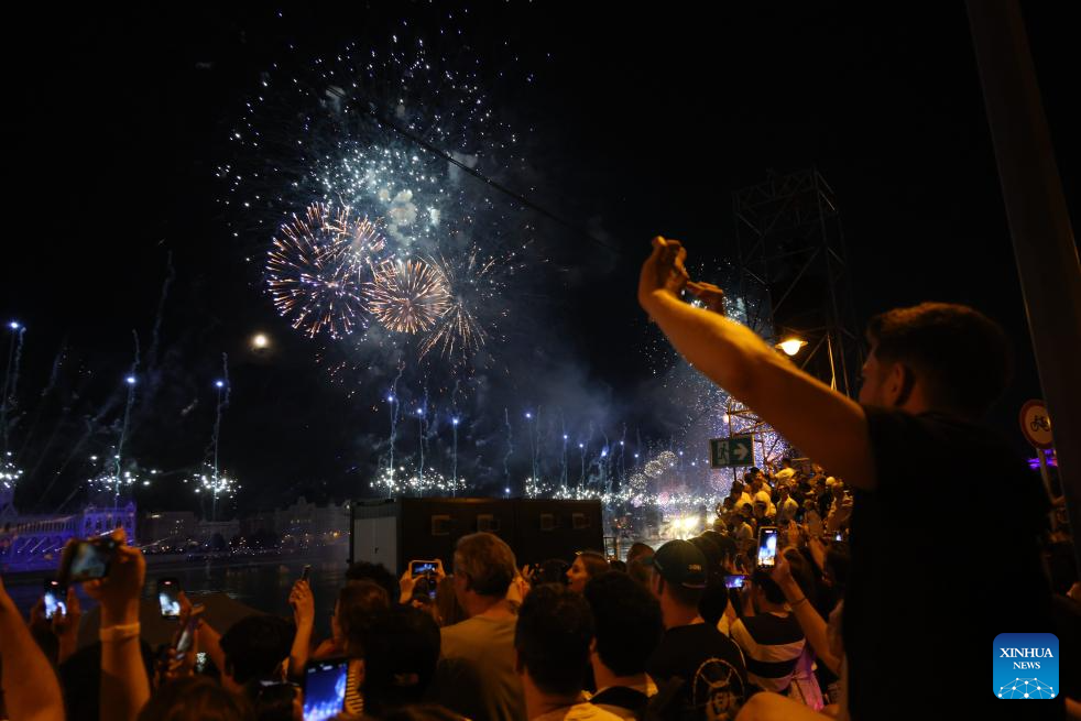 People watch fireworks to celebrate Hungary's state foundation day in downtown Budapest, Hungary, on Aug. 20, 2024. Hungary celebrated its state foundation day on Tuesday with a series of events across the nation, culminating in an airshow over the Danube River and a spectacular fireworks display. (Photo by Attila Volgyi/Xinhua)