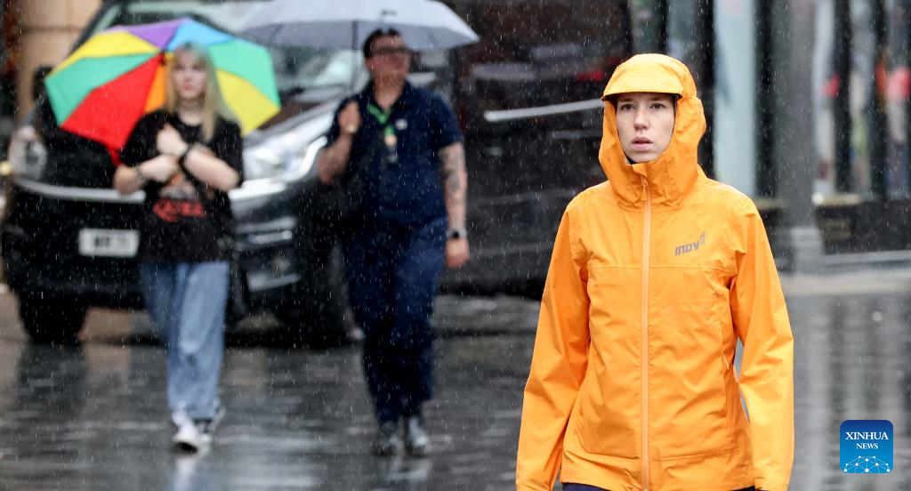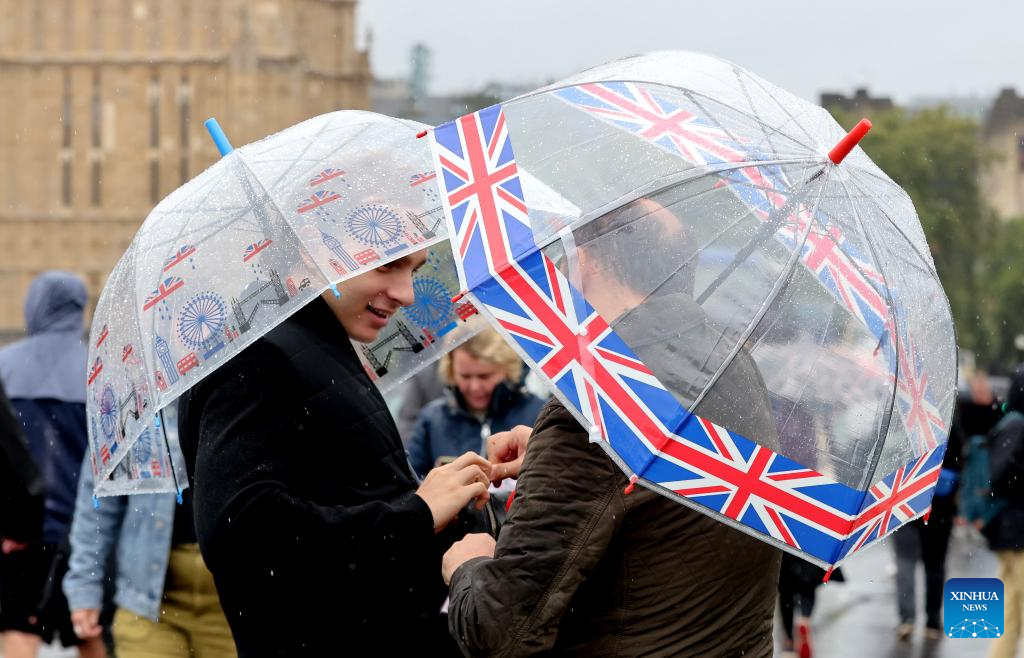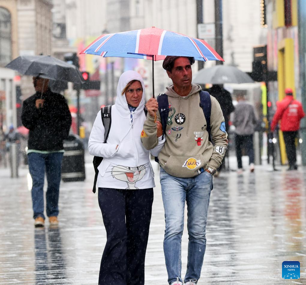 People walk in rain in London, Britain, Aug. 24, 2024. The Met Office, Britain's national meteorological service, issued a yellow alert for heavy rain across much of southeast England, as a storm hit some parts of the country Saturday. (Xinhua)