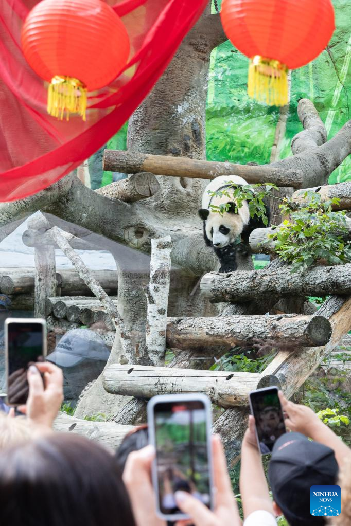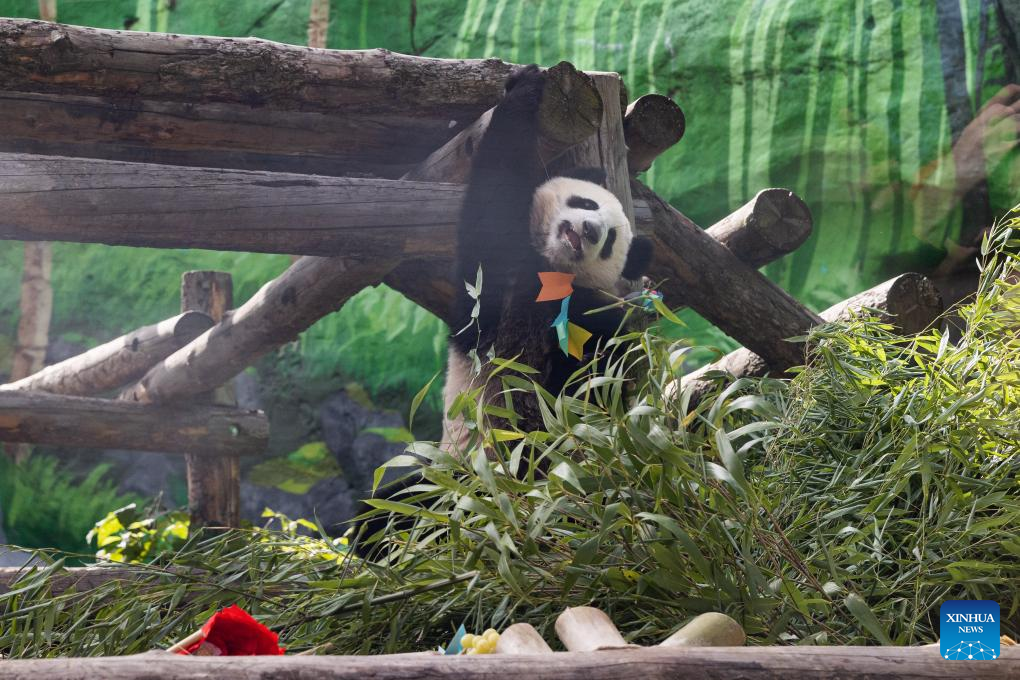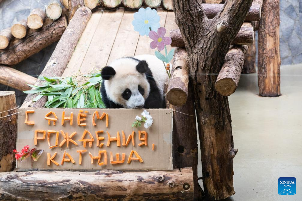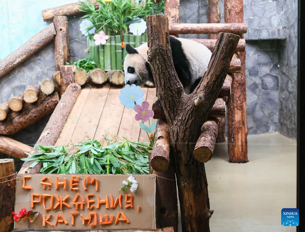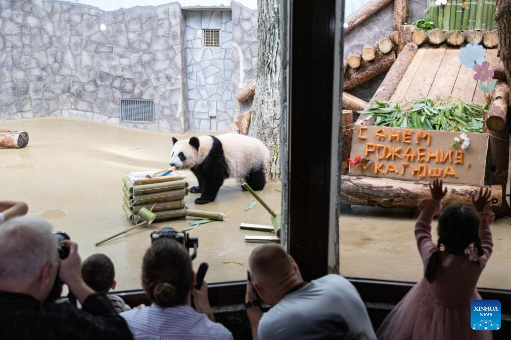 This photo taken on Aug. 24, 2024 shows giant panda cub Katyusha at Moscow Zoo in Moscow, Russia. Katyusha, the first giant panda cub born in Russia, turned one year old on Saturday. (Xinhua/Bai Xueqi)