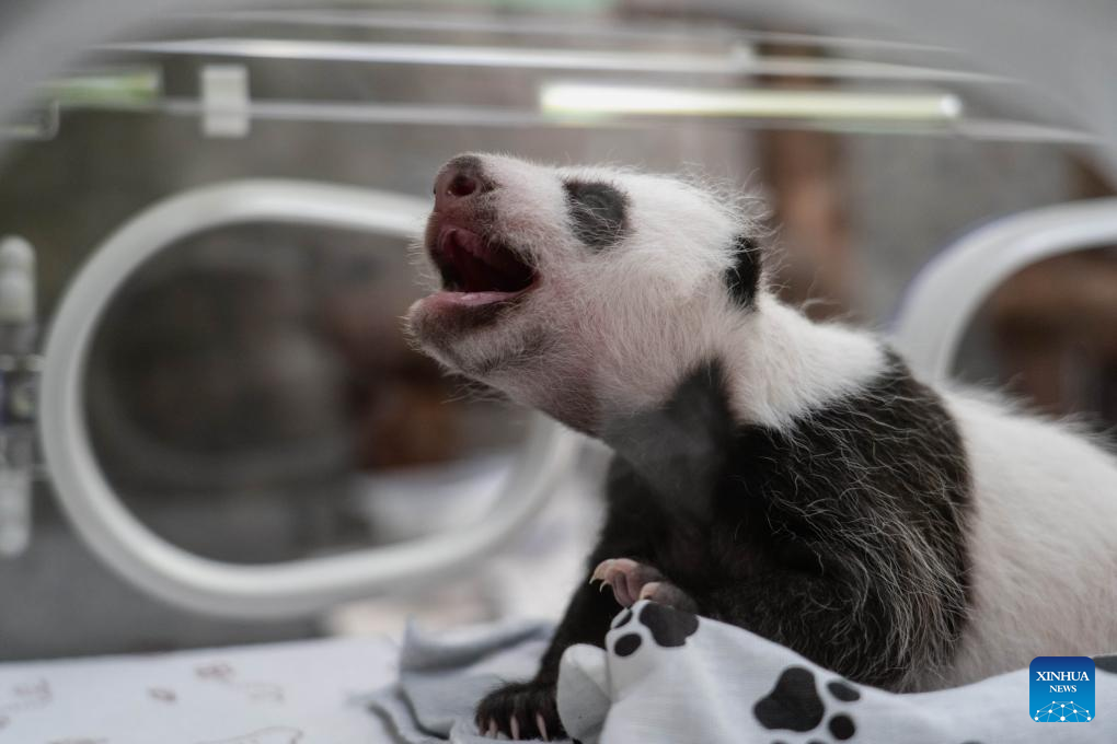 Giant panda cub Katyusha is pictured at Moscow Zoo in Moscow, Russia, Aug. 24, 2024. Katyusha, the first giant panda cub born in Russia, turned one year old on Saturday. (Xinhua/Bai Xueqi)
