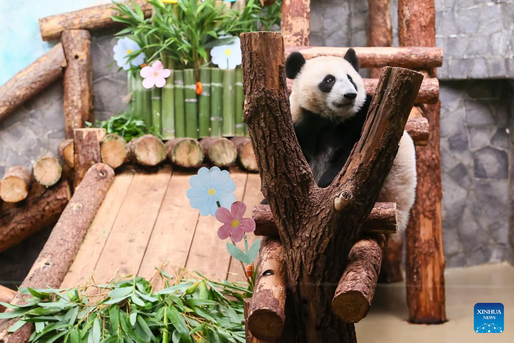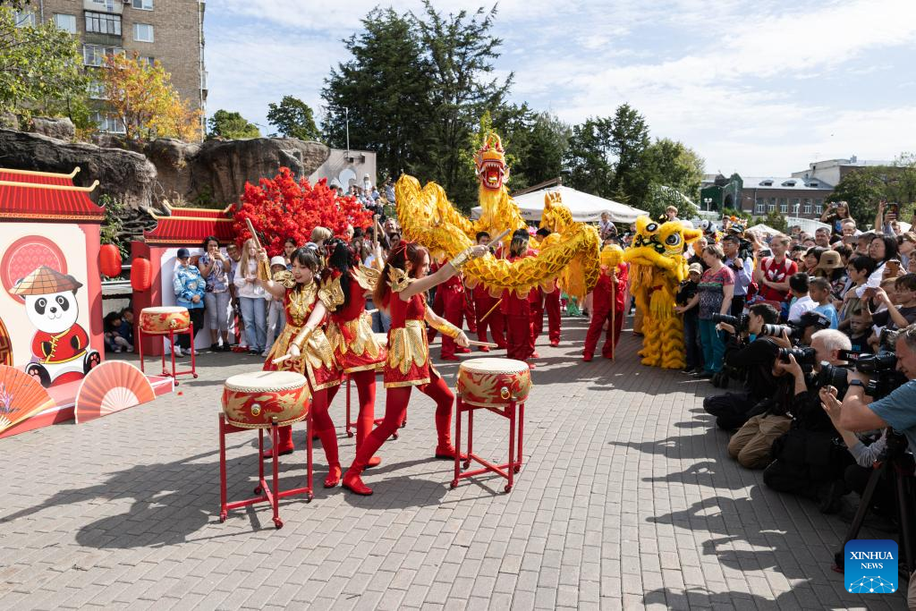 Performers stage a shows in celebration of giant panda cub Katyusha's birthday in Moscow, Russia, Aug. 24, 2024. Katyusha, the first giant panda cub born in Russia, turned one year old on Saturday. (Xinhua/Bai Xueqi)