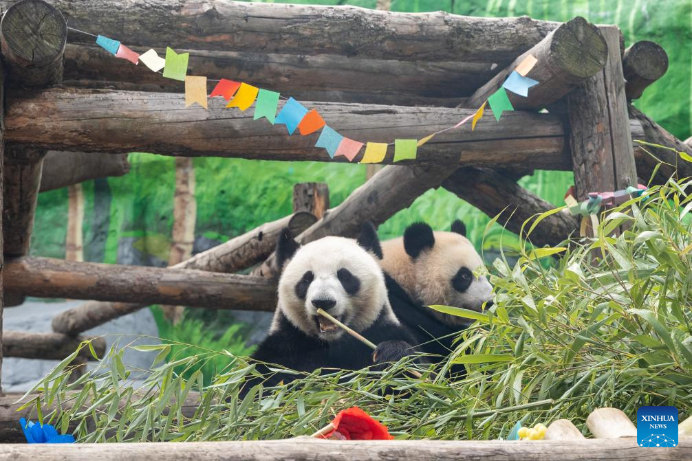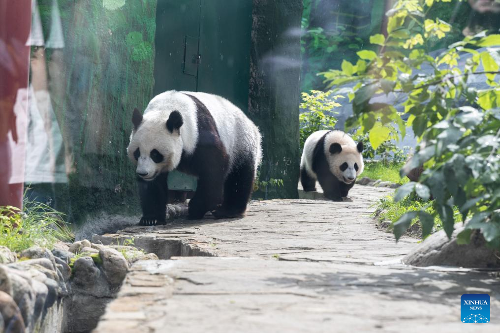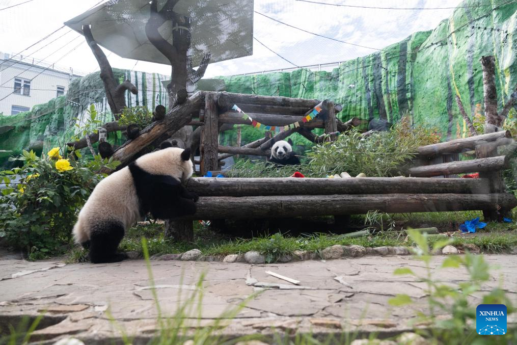 This photo taken on Aug. 24, 2024 shows giant panda cub Katyusha (R) and her mother Ding Ding at Moscow Zoo in Moscow, Russia. Katyusha, the first giant panda cub born in Russia, turned one year old on Saturday. (Xinhua/Bai Xueqi)