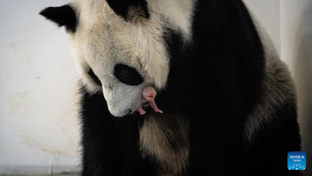 This photo taken on Aug. 28, 2023 shows giant panda cub Katyusha and her mother Ding Ding in Moscow, Russia. Katyusha, the first giant panda cub born in Russia, turned one year old on Aug. 24, 2024. (Moscow Zoo/Handout via Xinhua)