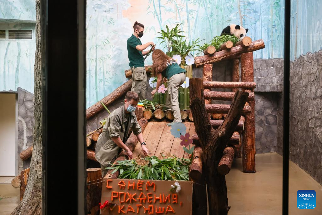 Staff members prepare a birthday treat for giant panda cub Katyusha at Moscow Zoo in Moscow, Russia, Aug. 24, 2024. Katyusha, the first giant panda cub born in Russia, turned one year old on Saturday. (Xinhua/Bai Xueqi)