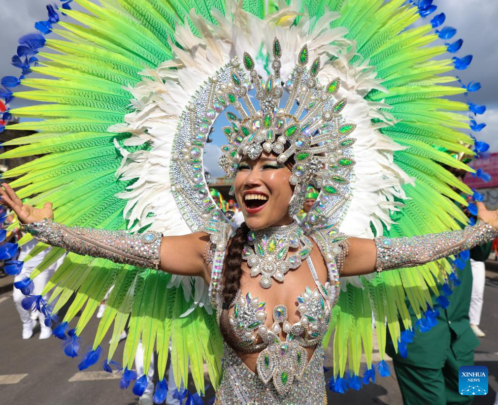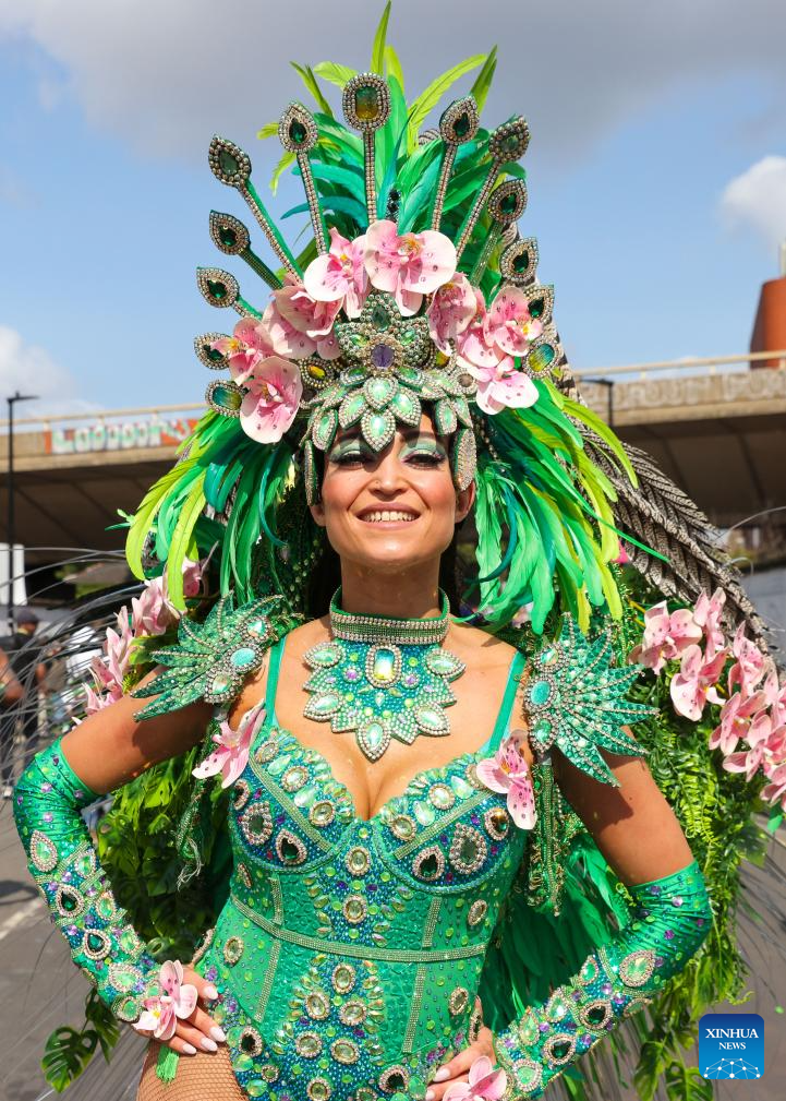 A performer participates in Notting Hill Carnival in London, Britain, on Aug. 26, 2024. Originated in the 1960s, the carnival is a way for Afro-Caribbean communities to celebrate their cultures and traditions. (Xinhua)