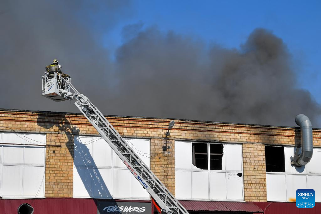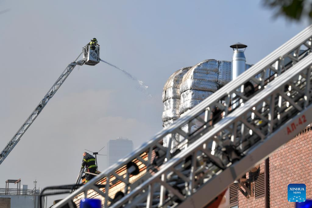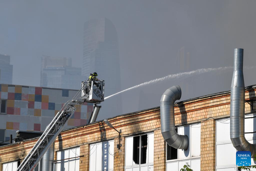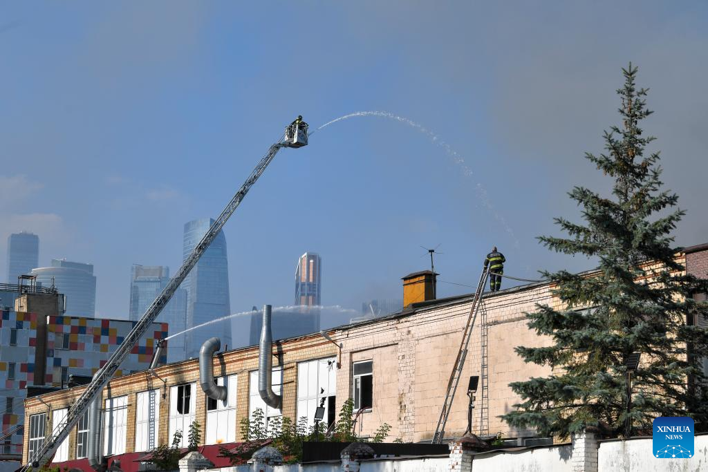 Firefighters work to extinguish a fire at Berezhkovskaya embankment in Moscow, Russia, on Aug. 31, 2024. More than 100 rescue workers with fire-fighting equipment were deployed to contain the blaze that spread across an area of 1,000 square meters, according to the Russian Emergency Situations Ministry. (Photo by Alexander Zemlianichenko Jr/Xinhua)