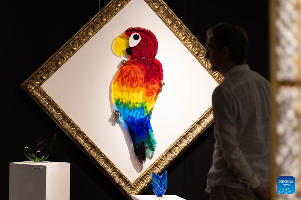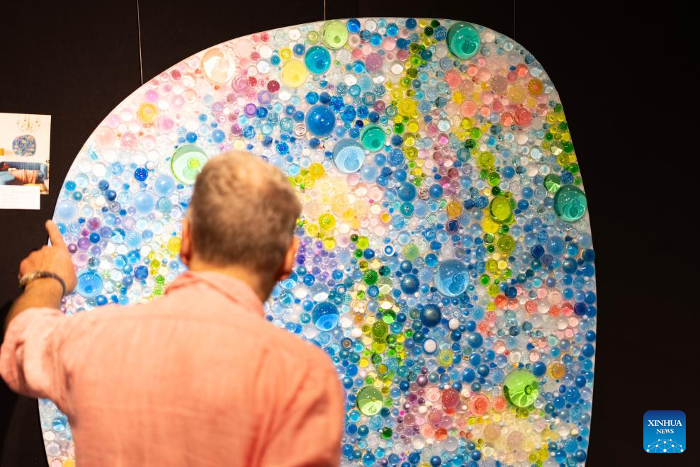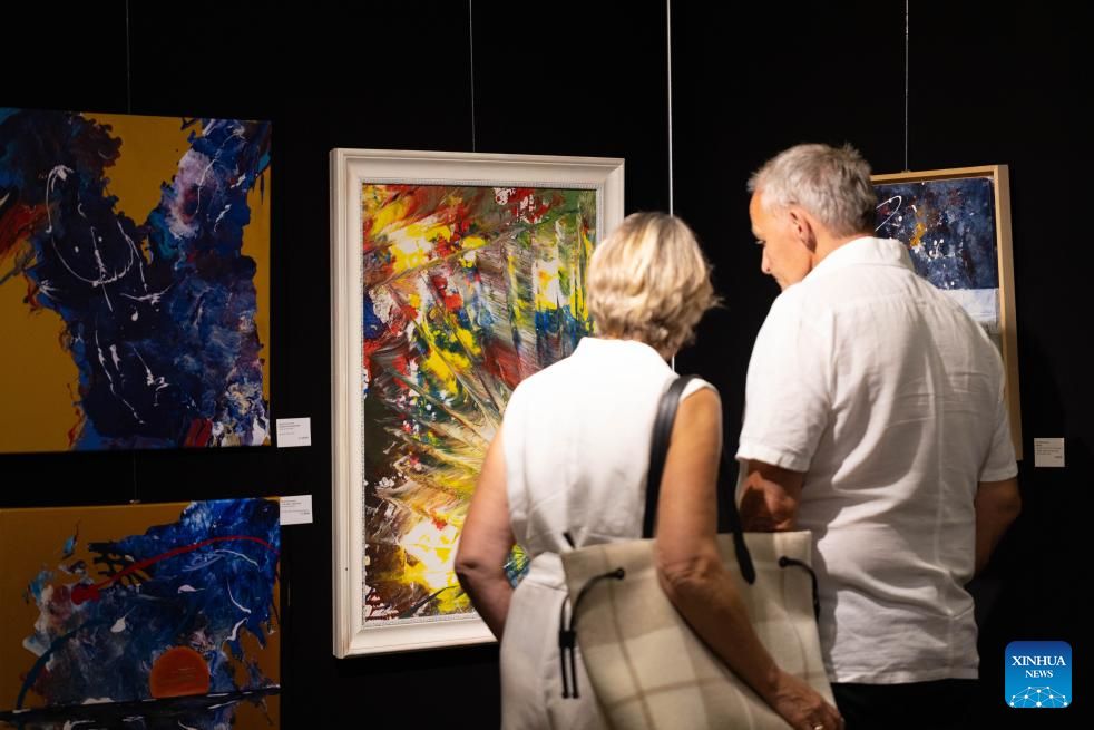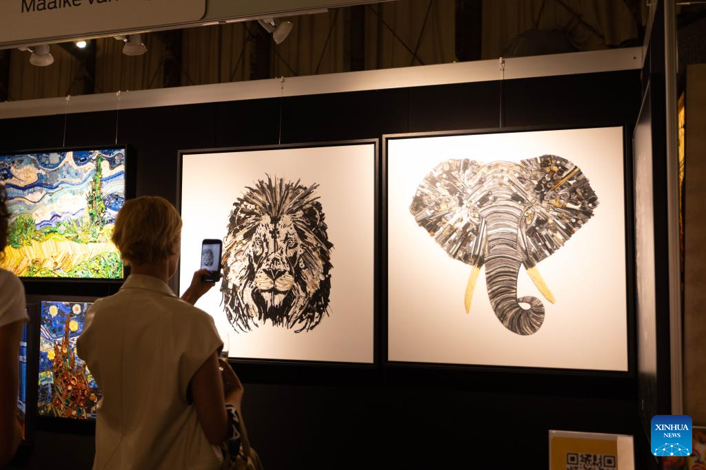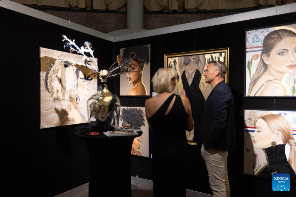 Visitors look at artwork during the fifth edition of the annual EuropArtFair in Amsterdam, the Netherlands, on Sept. 6, 2024. Artworks by professional contemporary artists from all over Europe are on display at the art fair which lasts from Sept. 6 to 8. (Photo by Sylvia Lederer/Xinhua)