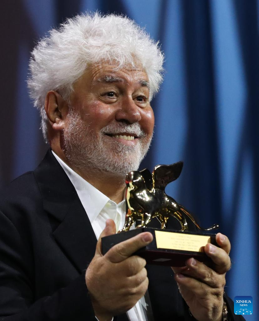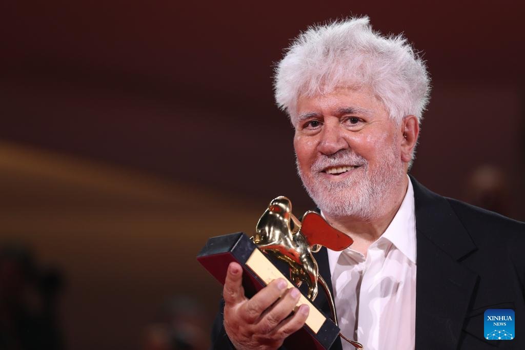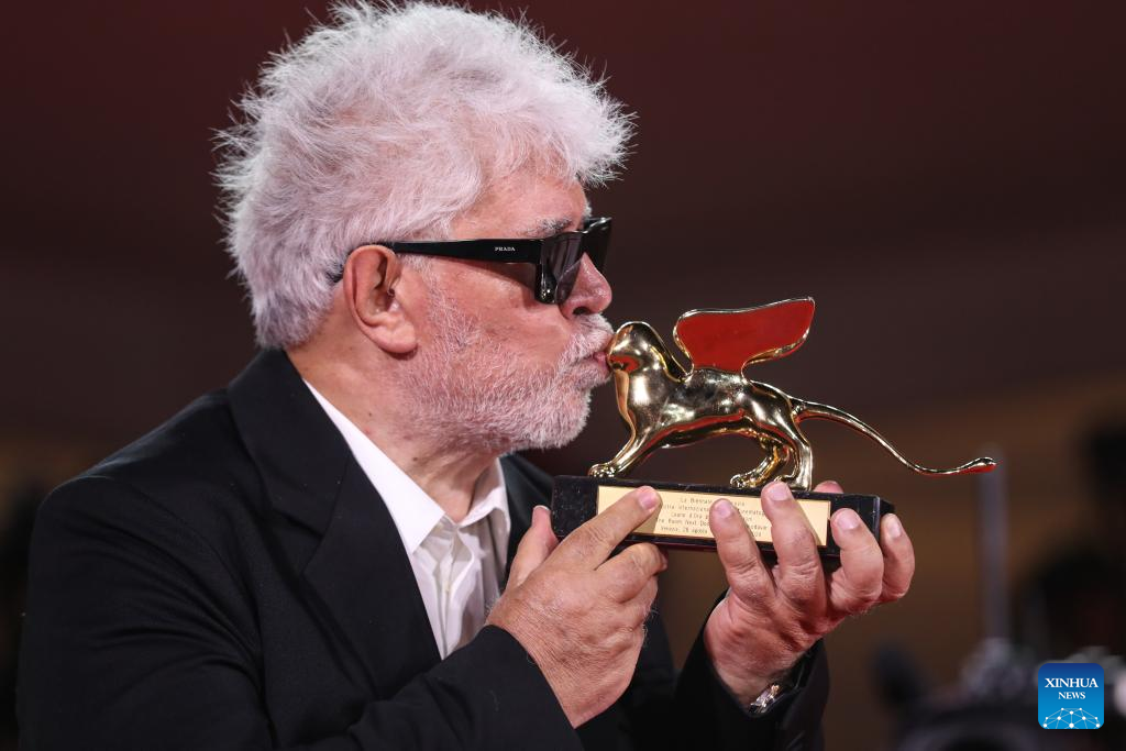 Spanish director Pedro Almodovar poses with the Golden Lion Award for Best Film for the movie "The Room Next Door" at the awards ceremony of the 81st Venice Film Festival in Venice, Italy, Sept. 7, 2024. The 81st Venice Film Festival closed here Saturday. (Xinhua/Li Jing)