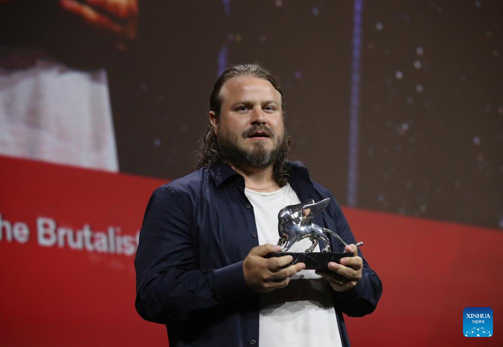 American director Brady Corbet poses with the Golden Lion Award for Best Director for the film "The Brutalist" at the awards ceremony of the 81st Venice Film Festival in Venice, Italy, Sept. 7, 2024. The 81st Venice Film Festival closed here Saturday. (Xinhua/Li Jing)
