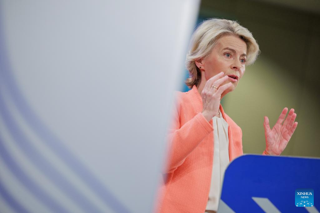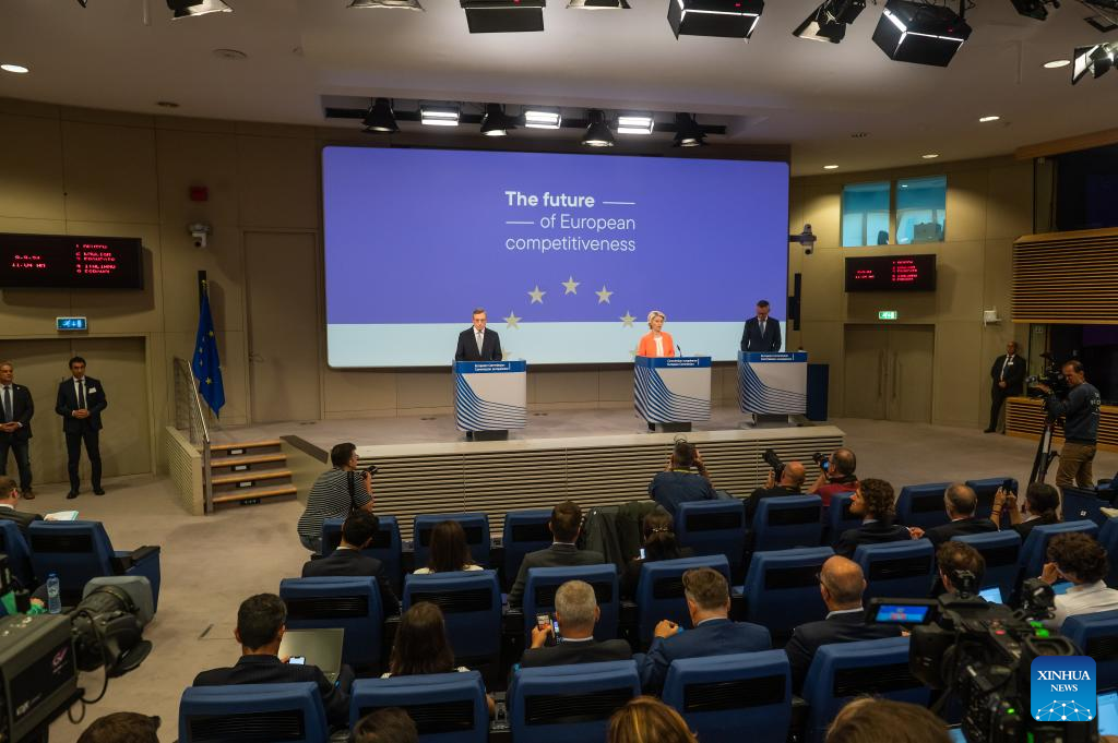 European Commission President Ursula von der Leyen attends a press conference on the report of the future of European competitiveness in Brussels, Belgium, on Sept. 9, 2024. Mario Draghi, former Italian prime minister and former governor of the European Central Bank, on Monday released a long-awaited report with his recommendations on how to improve the economic competitiveness of the European Union (EU). (European Union/Handout via Xinhua)