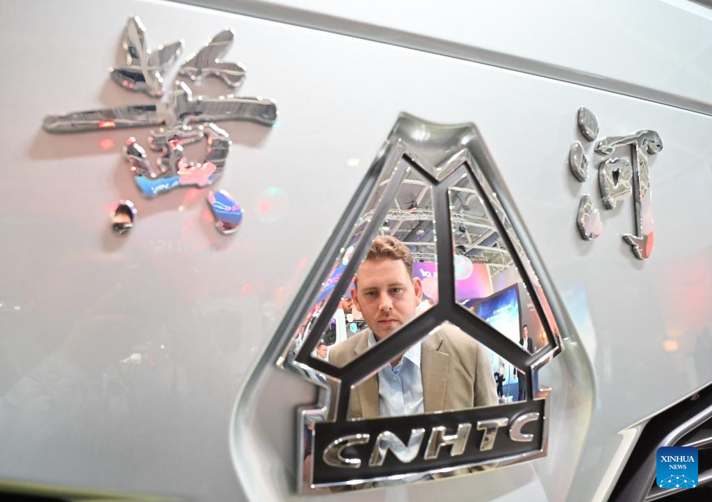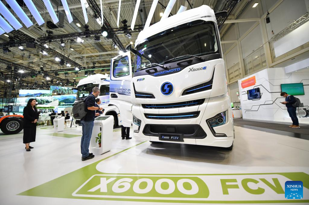 Visitors learn about a hydrogen fuel cell tractor at booth of the Shaanxi Automobile Holding Group Co., Ltd. (SHACMAN) during the media preview of the International Motor Show (IAA) Transportation 2024 in Hannover, Germany, Sept. 16, 2024. The IAA Transportation 2024 opened Tuesday in Hannover, Germany, aiming to advance climate neutrality in logistics and transportation through innovative transport systems.