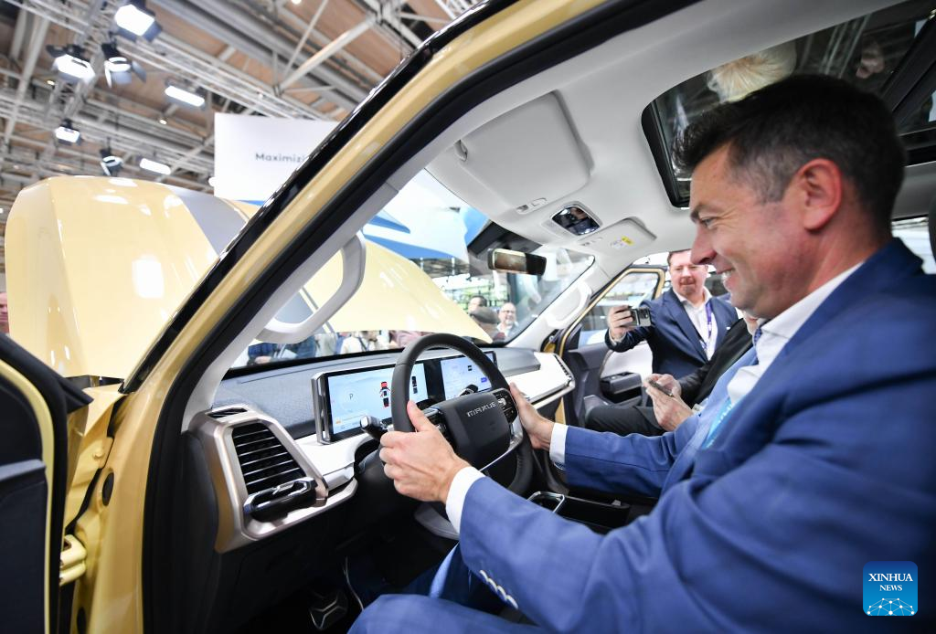 A man tries an electric pickup truck at the booth of Chinese automaker SAIC Maxus during the media preview of the International Motor Show (IAA) Transportation 2024 in Hannover, Germany, Sept. 16, 2024. The IAA Transportation 2024 opened Tuesday in Hannover, Germany, aiming to advance climate neutrality in logistics and transportation through innovative transport systems.