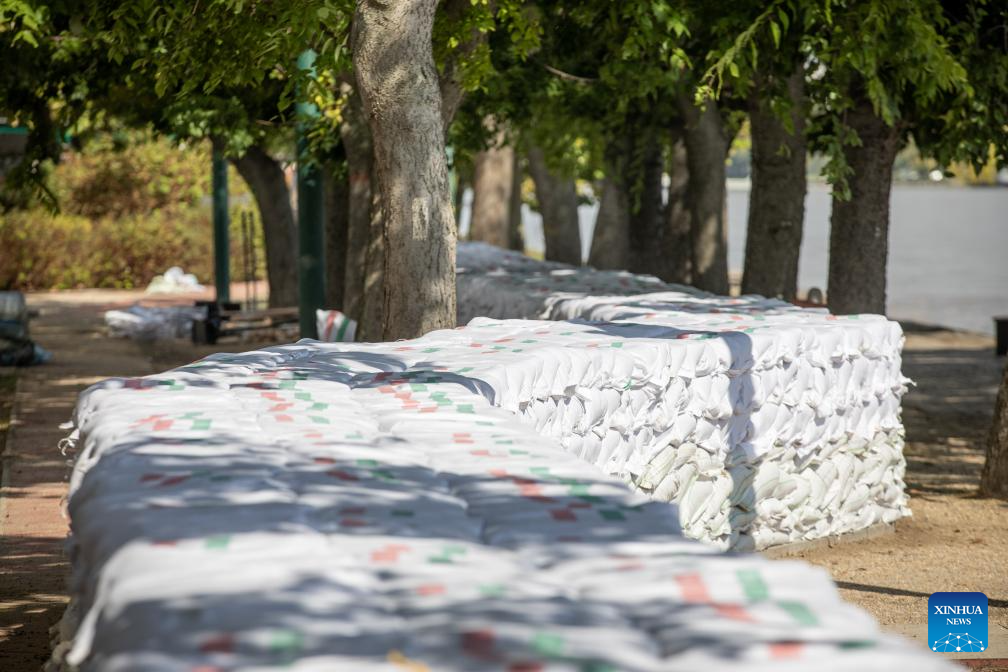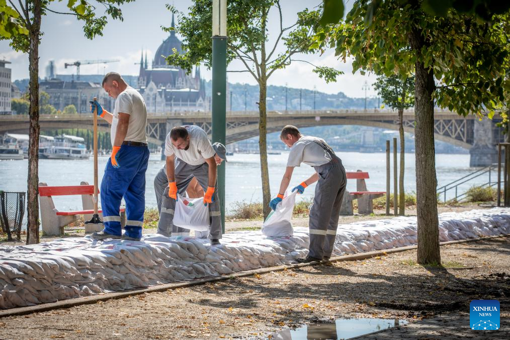 Sandbags are seen on the bank of Margaret Island to prevent the flood in Budapest, Hungary, Sept. 17, 2024. (Photo by Attila Volgyi/Xinhua)
