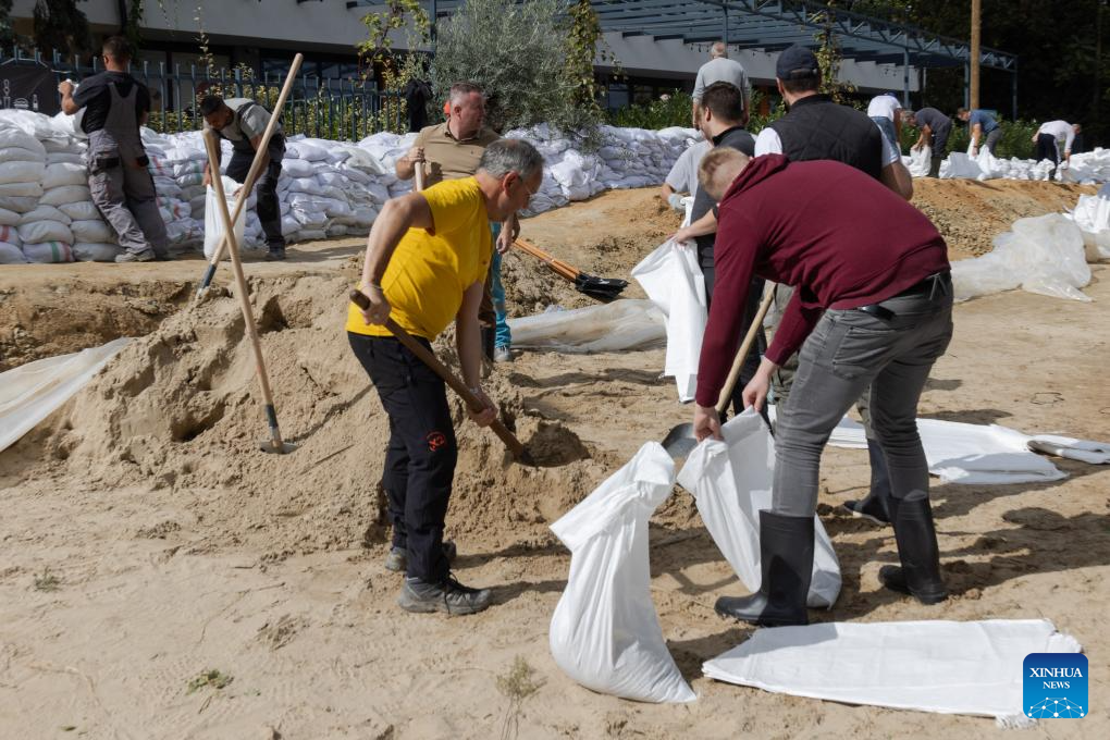 People fill sandbags to prevent the flood in Budapest, Hungary, Sept. 17, 2024. (Photo by Attila Volgyi/Xinhua)