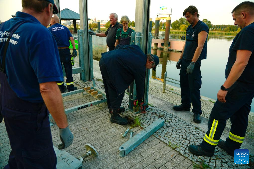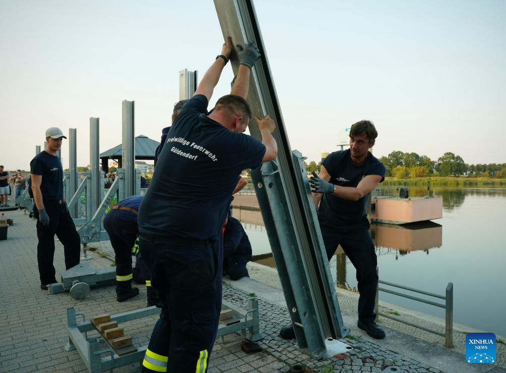 Members of the fire brigade build the flood barrier in preparation for heavy rain in the city of Frankfurt (Oder) in Germany near the Polish border, Sept. 17, 2024. (Photo by Jaap Arriens/Xinhua)