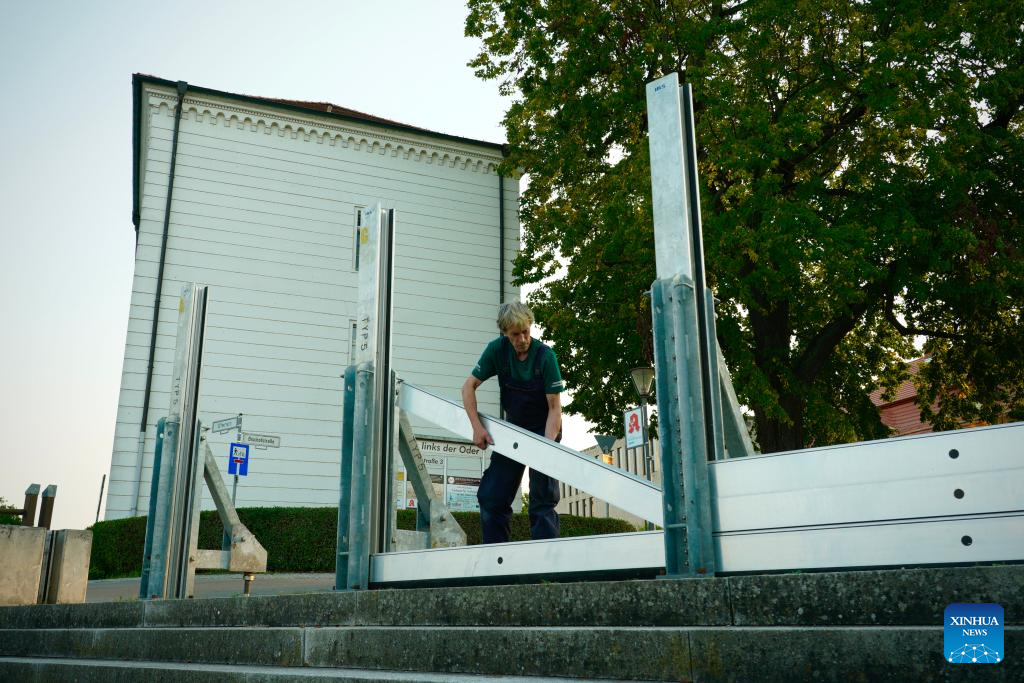A member of the fire brigade builds the flood barrier in preparation for heavy rain in the city of Frankfurt (Oder) in Germany near the Polish border, Sept. 17, 2024. (Photo by Jaap Arriens/Xinhua)