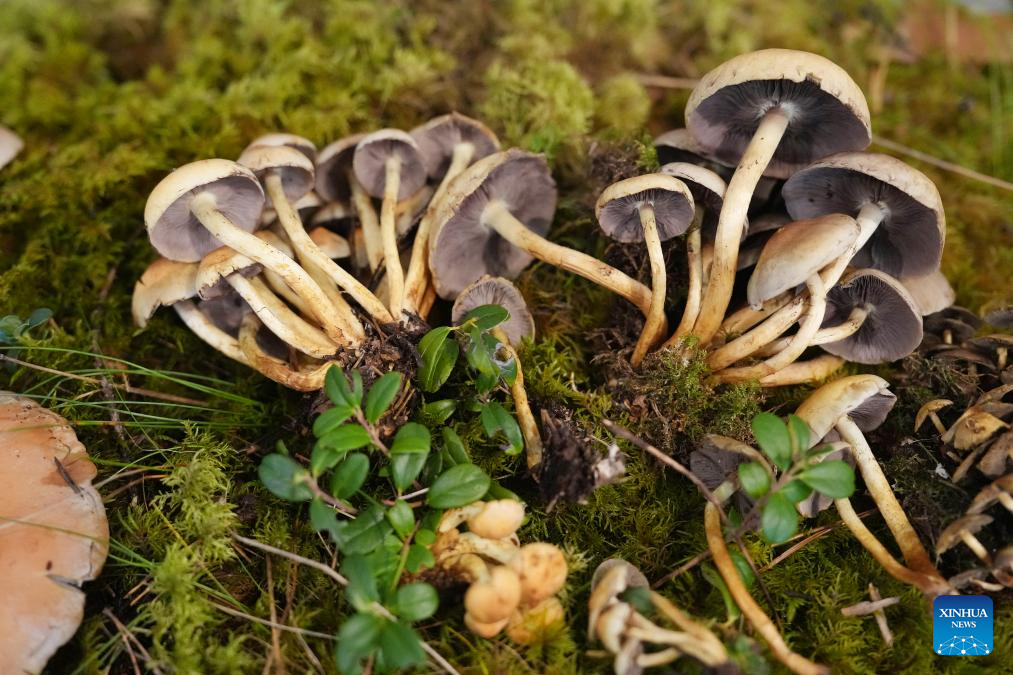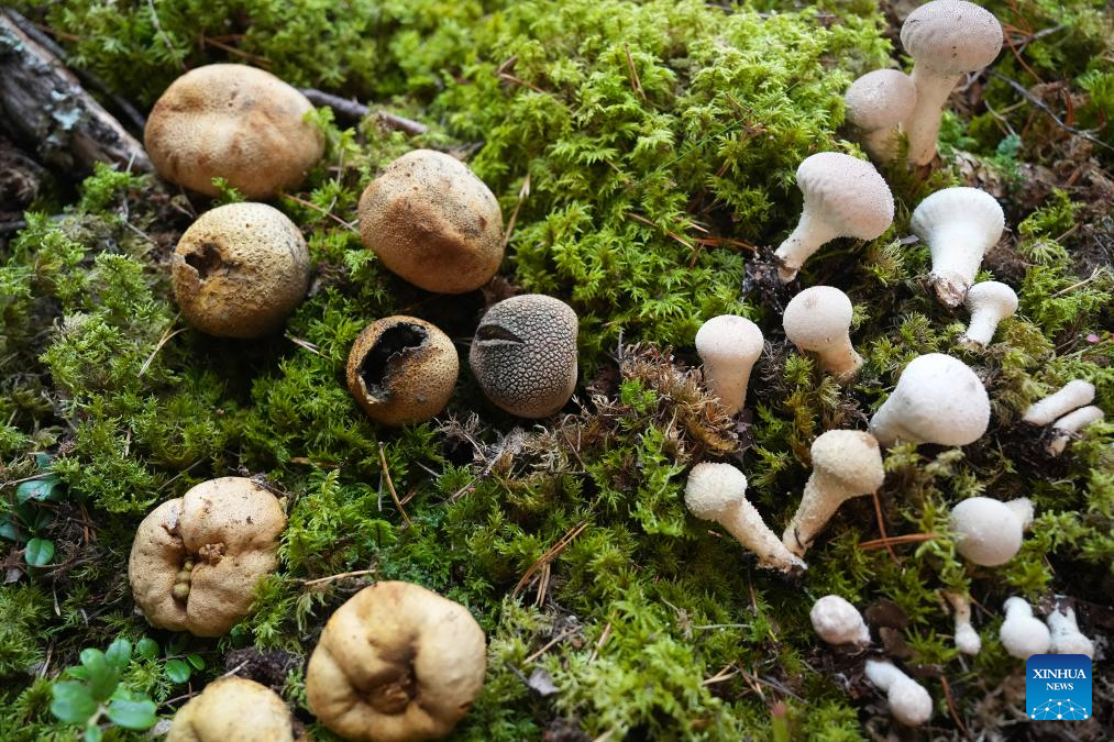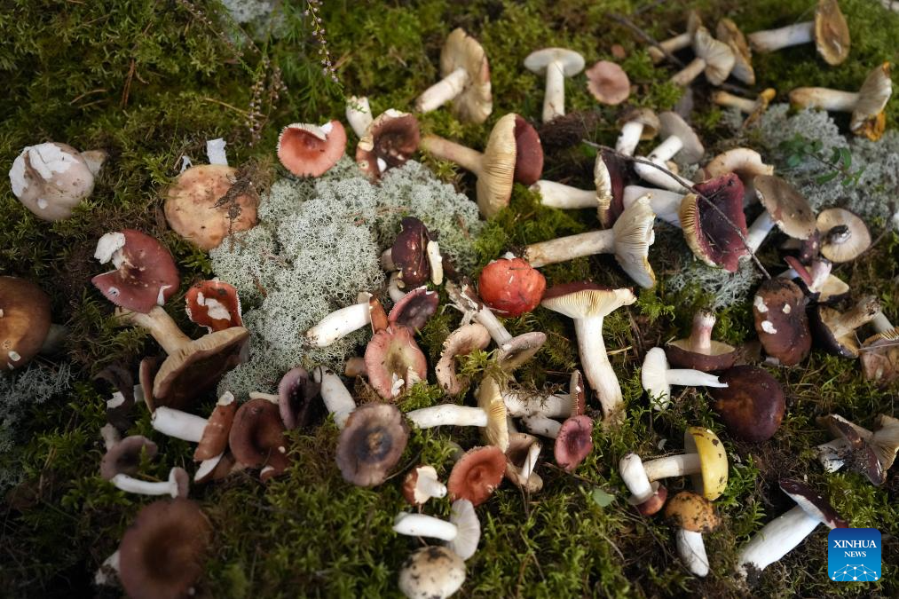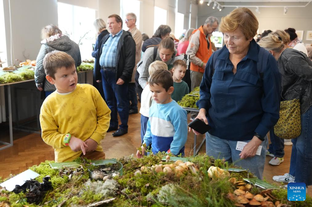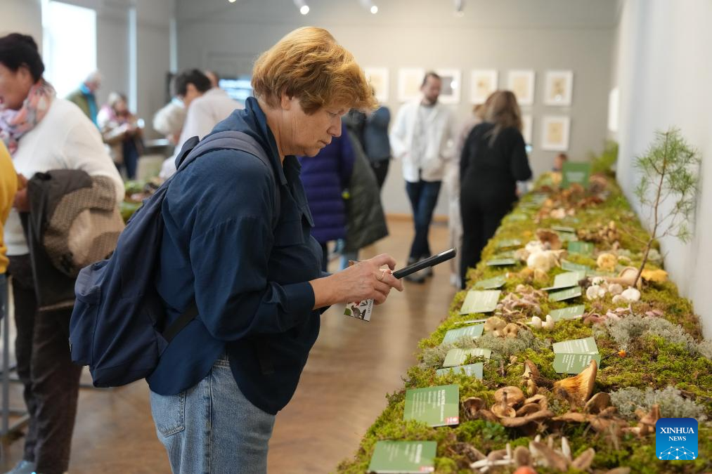 People visit a mushroom exhibition at Latvian Museum of Natural History in Riga, Latvia, on Oct. 4, 2024. The exhibition is held here from Oct. 4 to Oct. 6. (Photo by Edijs Palens/Xinhua)
