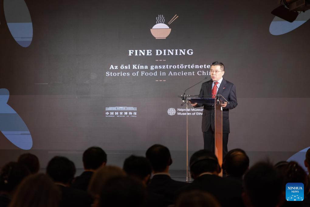 Chinese Ambassador to Hungary Gong Tao speaks during the opening ceremony of the "Fine Dining: Food Stories of Ancient China" exhibition in Budapest, Hungary on Oct. 15, 2024. The Hungarian Museum of Ethnography in Budapest opened the highly anticipated exhibition "Fine Dining: Food Stories of Ancient China" on Tuesday, offering visitors a fascinating journey through China's ancient culinary traditions.