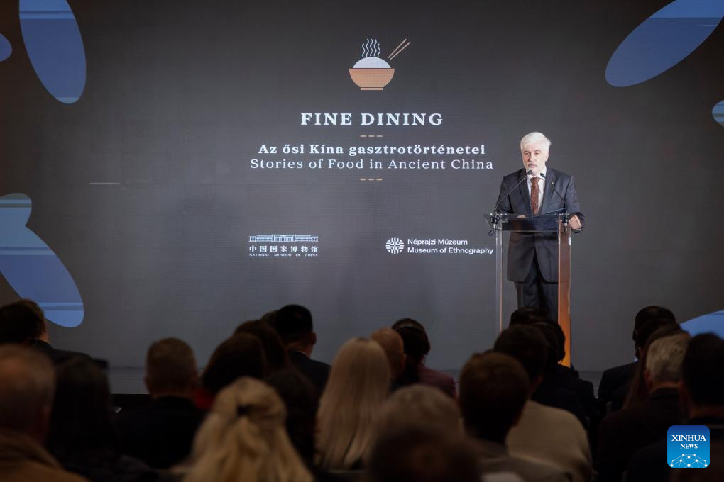 Deputy Secretary of State Gabor Csaba, representing Hungary's Ministry of Culture and Innovation, speaks during the opening ceremony of the "Fine Dining: Food Stories of Ancient China" exhibition in Budapest, Hungary on Oct. 15, 2024. The Hungarian Museum of Ethnography in Budapest opened the highly anticipated exhibition "Fine Dining: Food Stories of Ancient China" on Tuesday, offering visitors a fascinating journey through China's ancient culinary traditions.