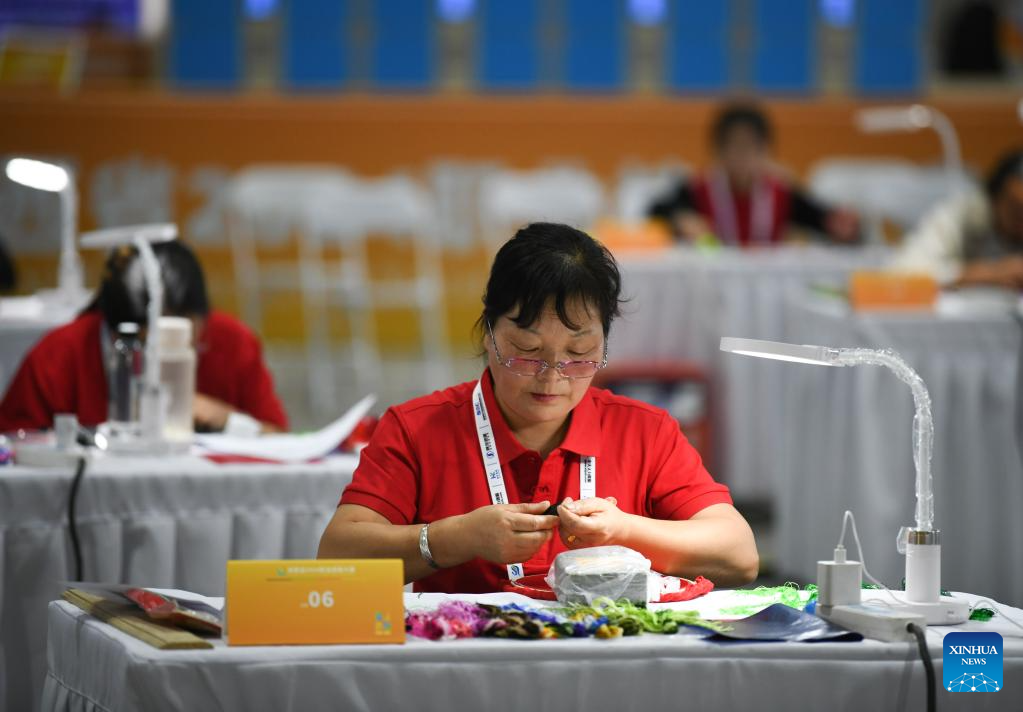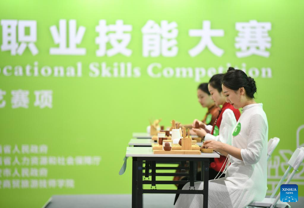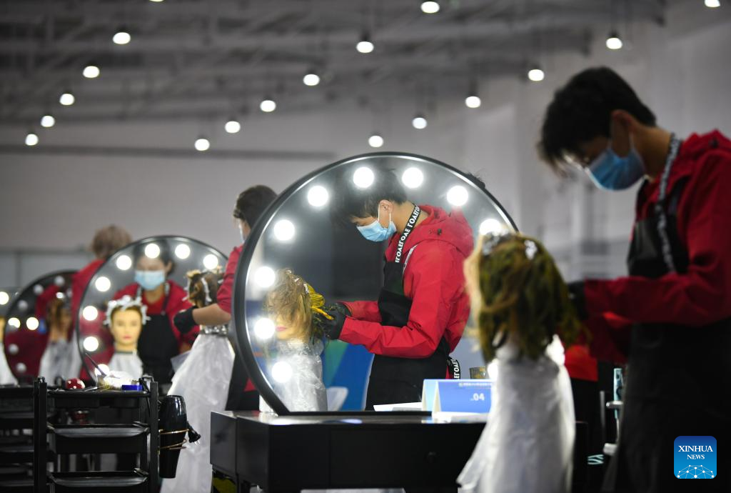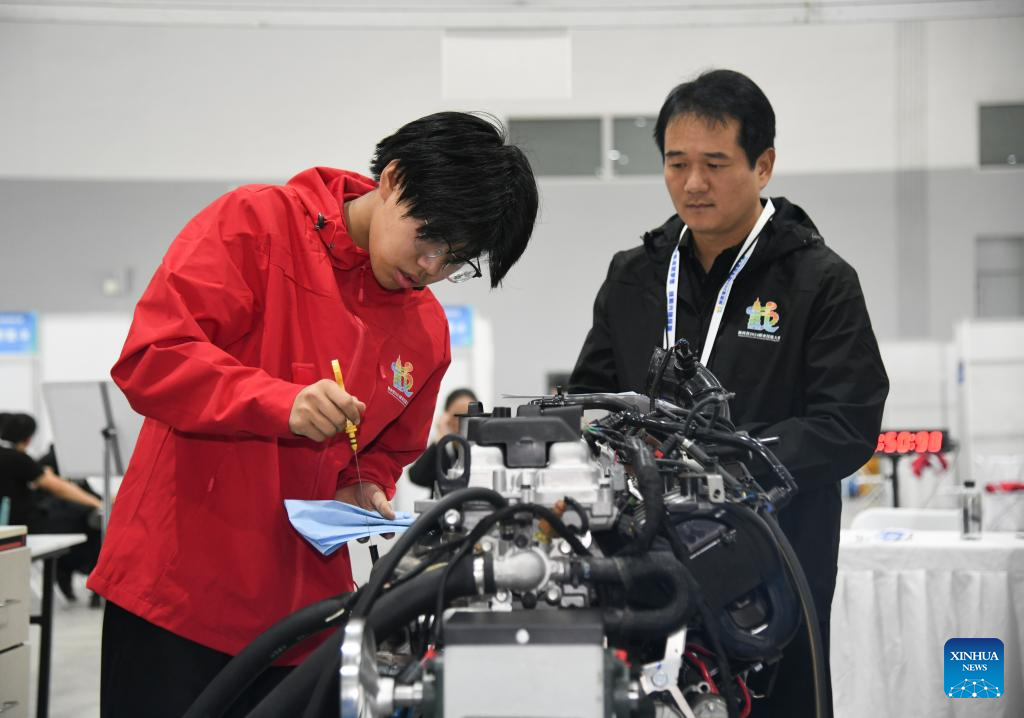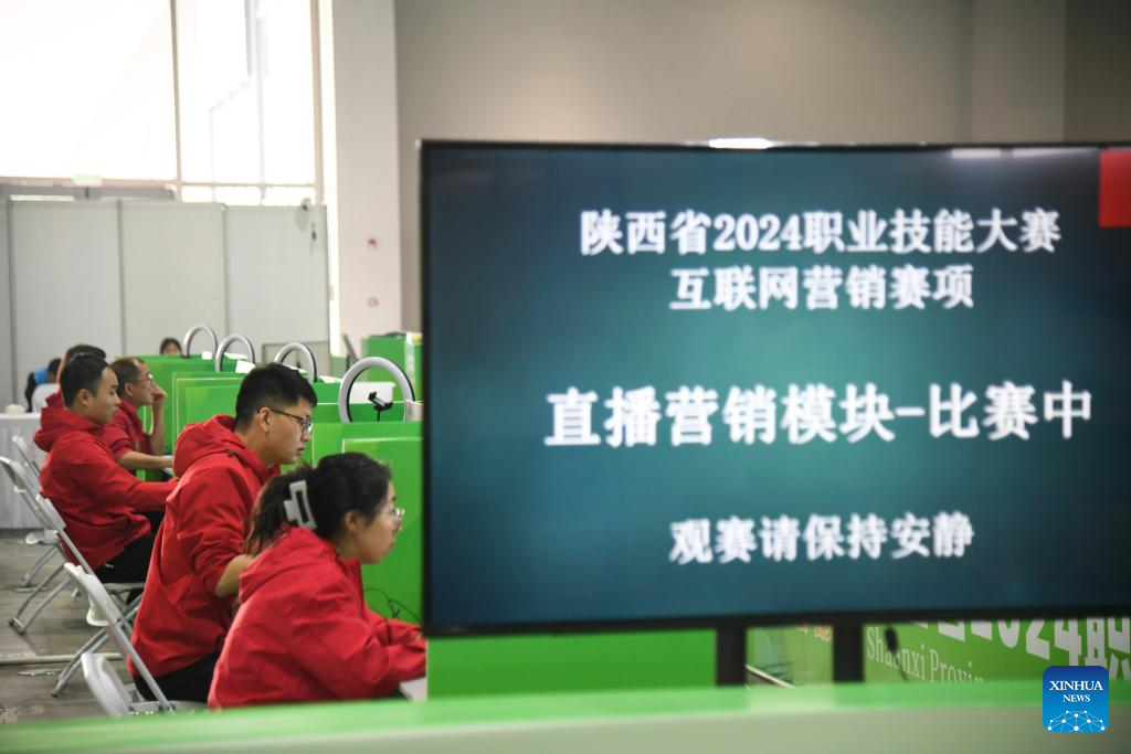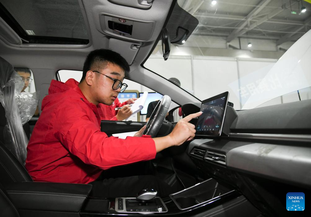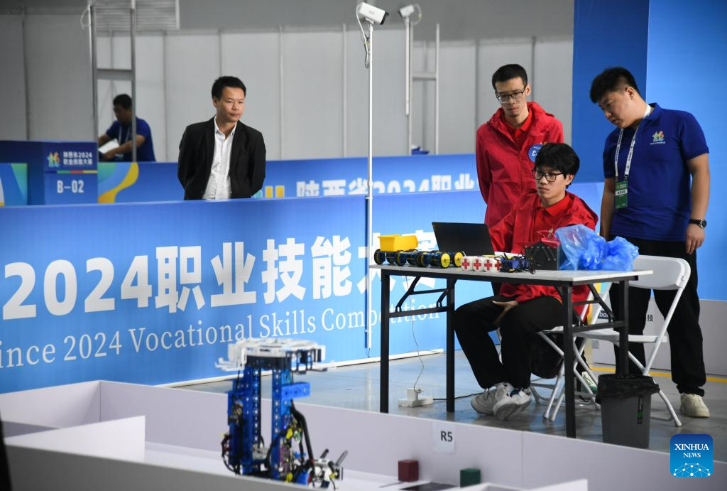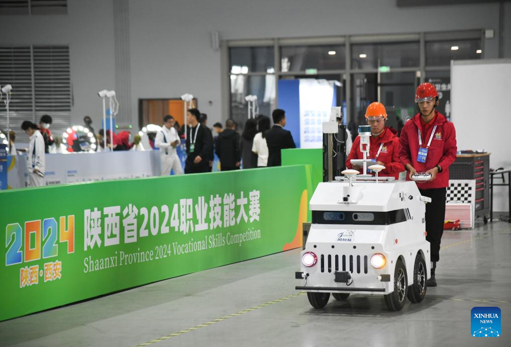 Participants compete in a vocational skills competition in Xi'an, northwest China's Shaanxi Province, Oct. 16, 2024. The competition kicked off Wednesday in Xi'an, featuring 20 categories like mobile robots, internet marketing, and intelligent technology of NEVs. (Xinhua/Zhang Bowen)