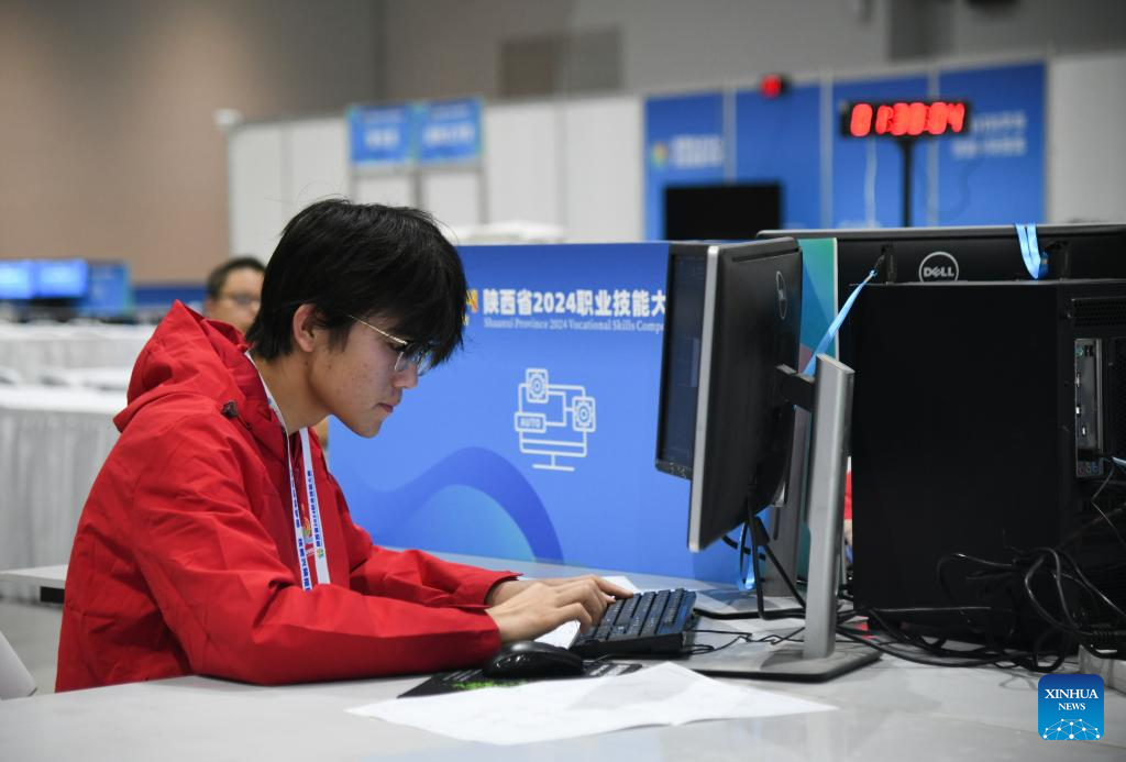 A participant competes in a vocational skills competition in Xi'an, northwest China's Shaanxi Province, Oct. 16, 2024. The competition kicked off Wednesday in Xi'an, featuring 20 categories like mobile robots, internet marketing, and intelligent technology of NEVs. (Xinhua/Zhang Bowen)