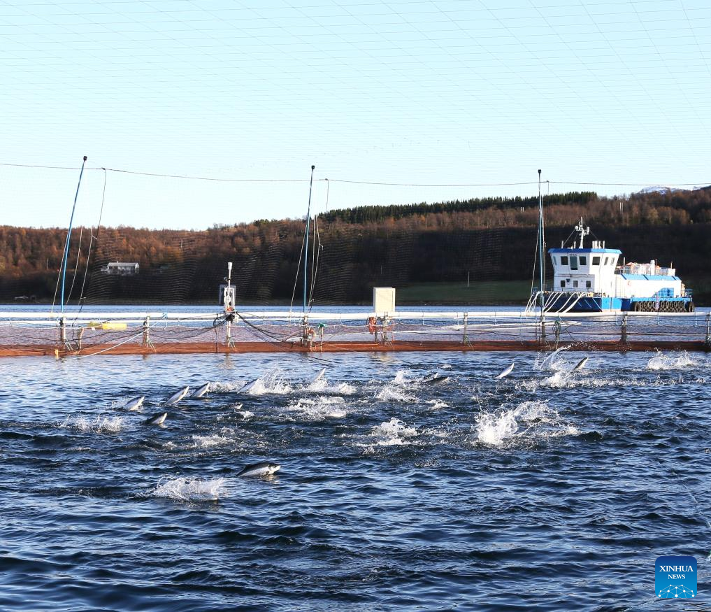 This photo taken on Oct. 10, 2023 shows a salmon farm in the fjord of Troms County in northern Norway. (Xinhua/Zhang Yuliang)