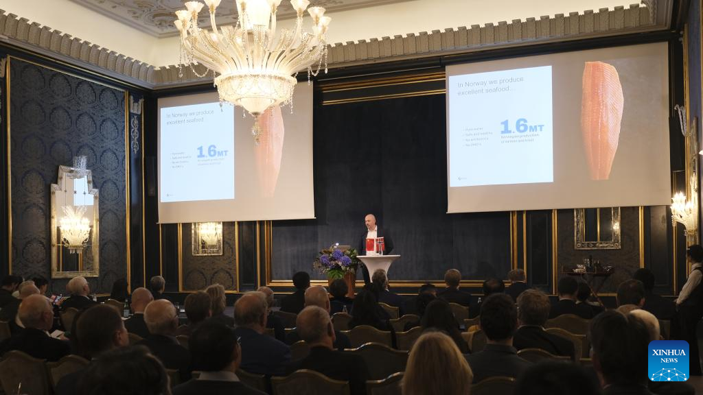 Christoffer Maroy, Head of Finance and Sustainability at Eide Fjordbruk, speaks at a seminar hosted by the Norwegian Chinese Chamber of Commerce in Oslo, capital of Norway, on Oct. 17, 2024. (Photo by Chen Yaqin/Xinhua)