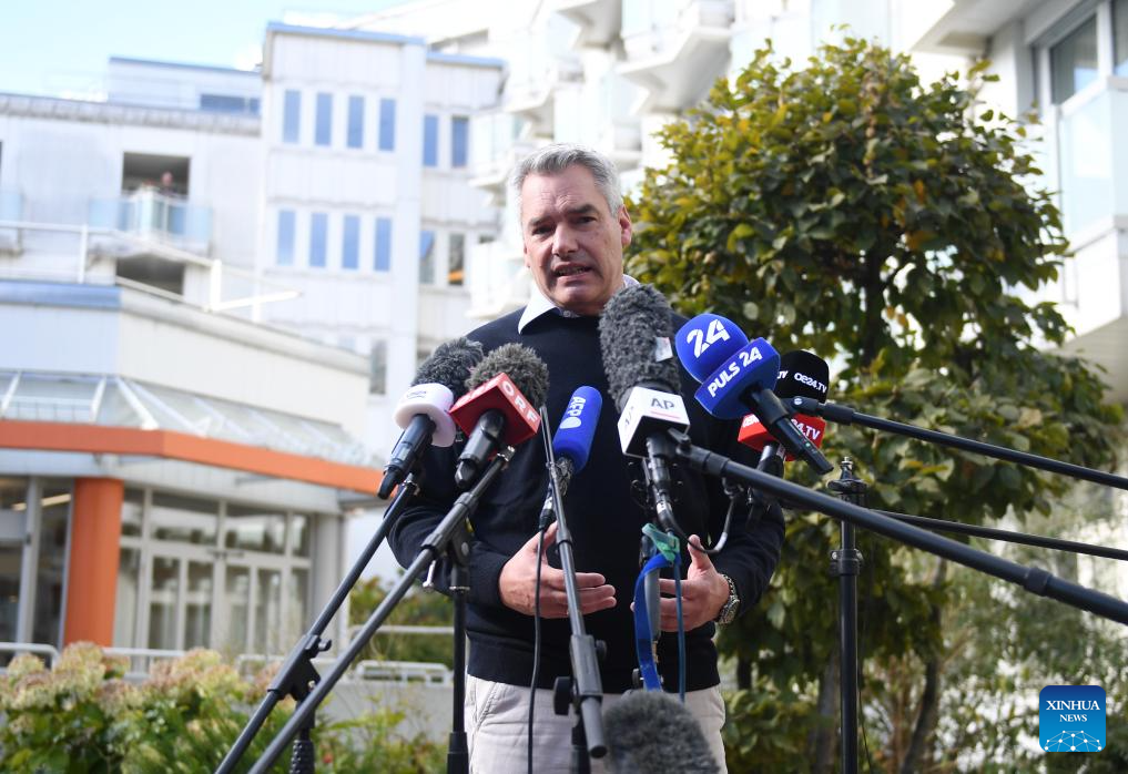 File photo taken on Sept. 29, 2024 shows Austrian Chancellor Karl Nehammer speaking to media at a polling station in Vienna, Austria. Austrian President Alexander Van der Bellen on Oct. 22 tasked incumbent Chancellor Karl Nehammer, leader of the center-right People's Party, with forming a coalition government following September's general election. (Xinhua/He Canling)