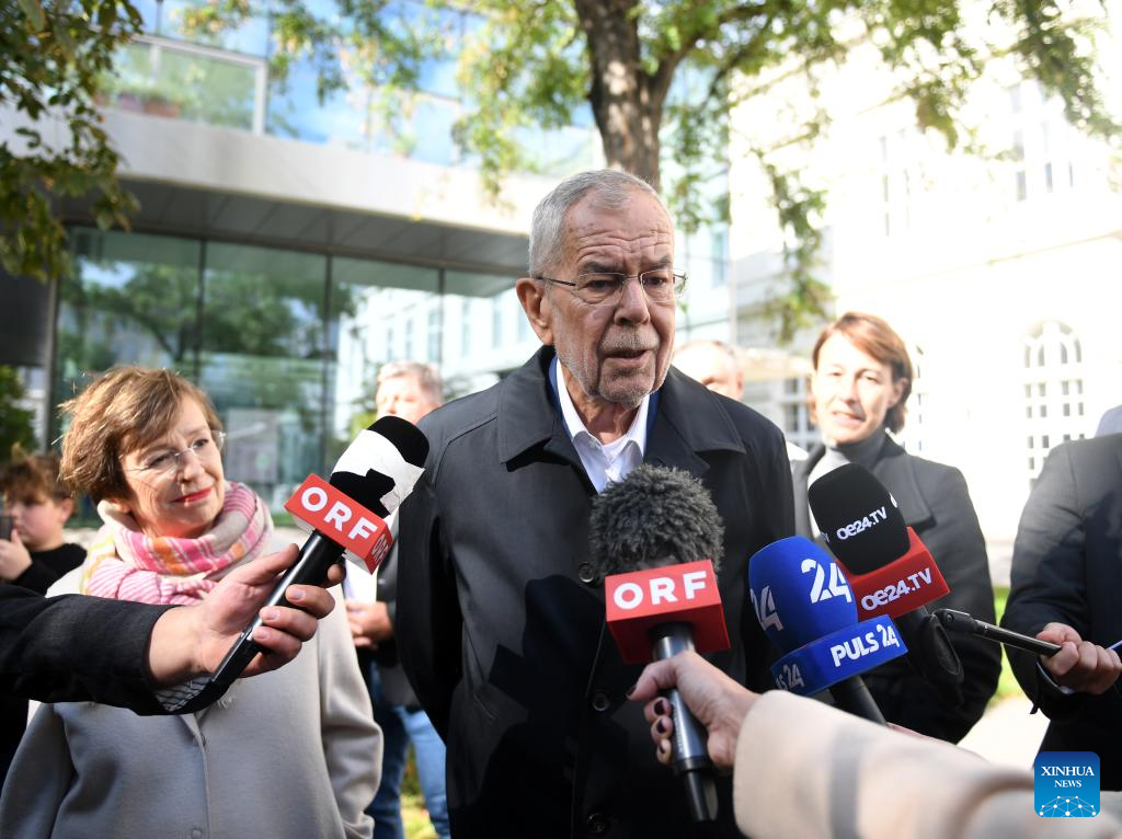 File photo taken on Sept. 29, 2024 shows Alexander Van der Bellen (C) speaking to media at a polling station in Vienna, Austria.