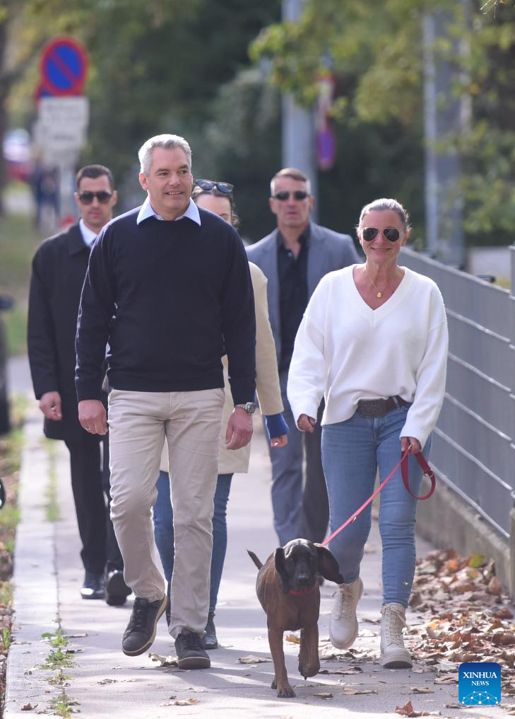 File photo taken on Sept. 29, 2024 shows Karl Nehammer (L, front) walking to a polling station in Vienna, Austria.