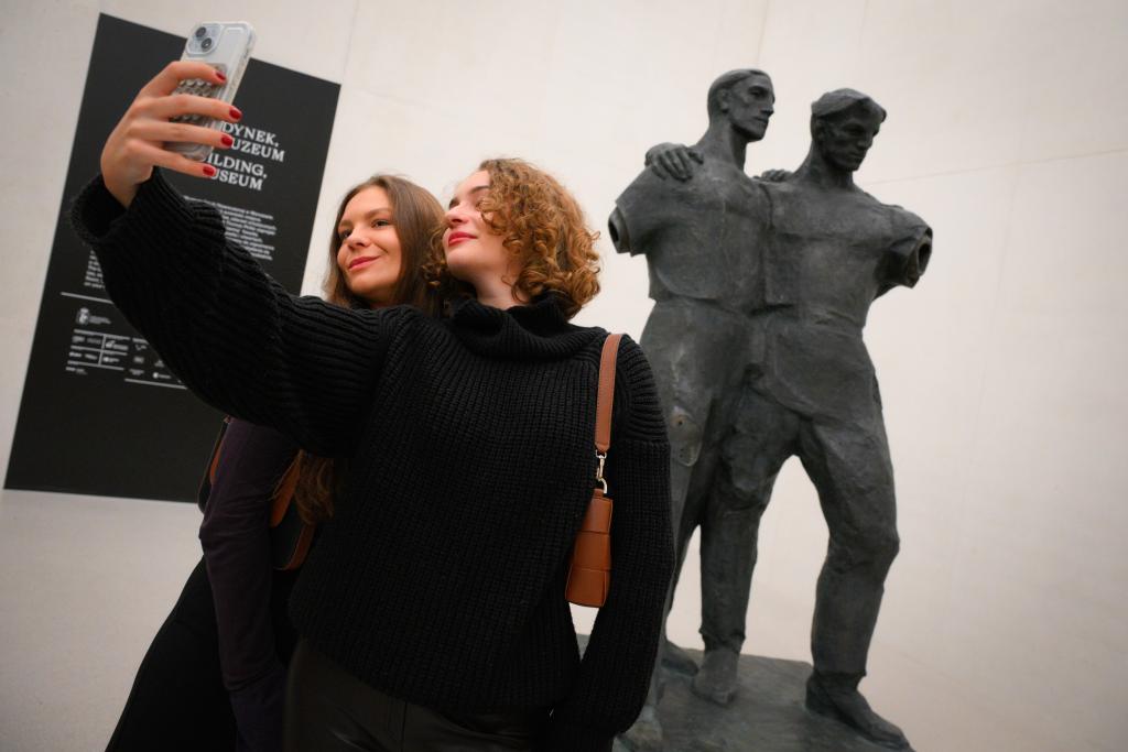 Two visitors take selfies with a sculpture displayed in the new building of Museum of Modern Art in Warsaw, Poland on Oct. 25, 2024.