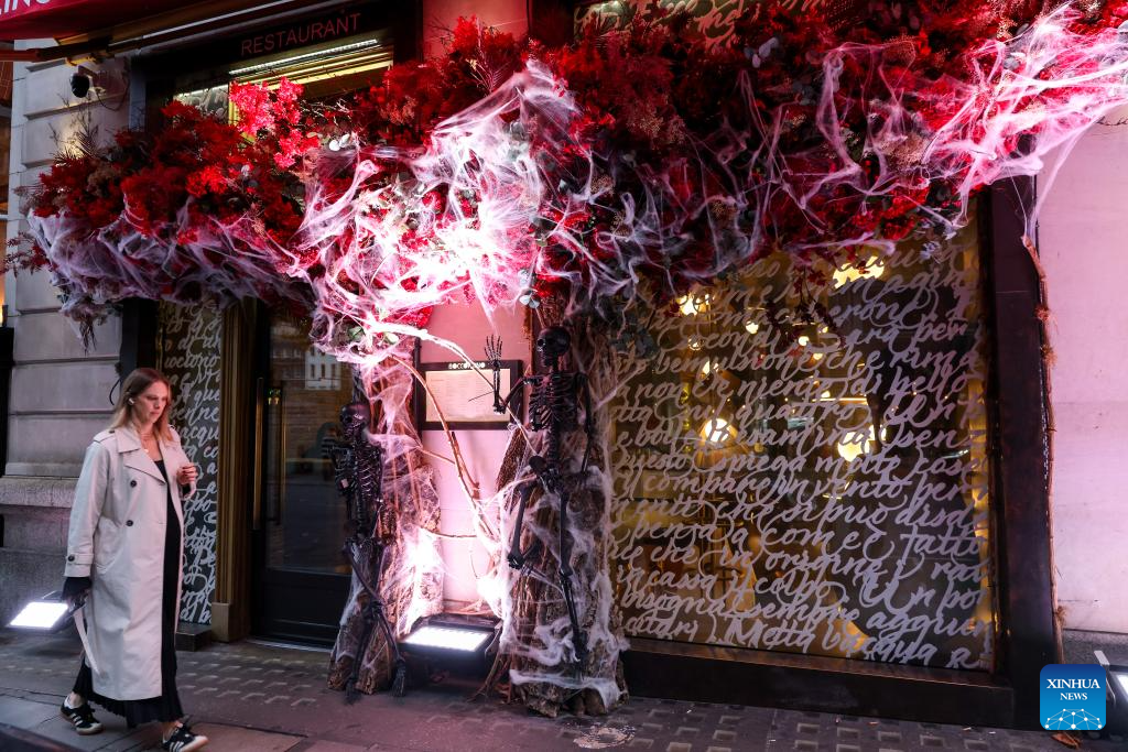 A woman walks past Halloween decorations outside a shop in London, Britain, Oct. 31, 2024. (Xinhua)