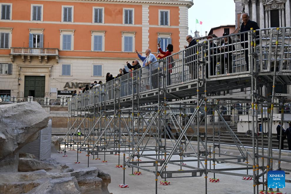 Tourists view the Trevi Fountain from a new walkway in Rome, Italy, Nov. 9, 2024. Rome inaugurated an elevated walkway across the front of the Trevi Fountain on Saturday as the Baroque monument undergoes maintenance work. The redesign will provide visitors a closer view of the site, while also ensuring a steady movement of visitors. (Photo by Alberto Lingria/Xinhua)